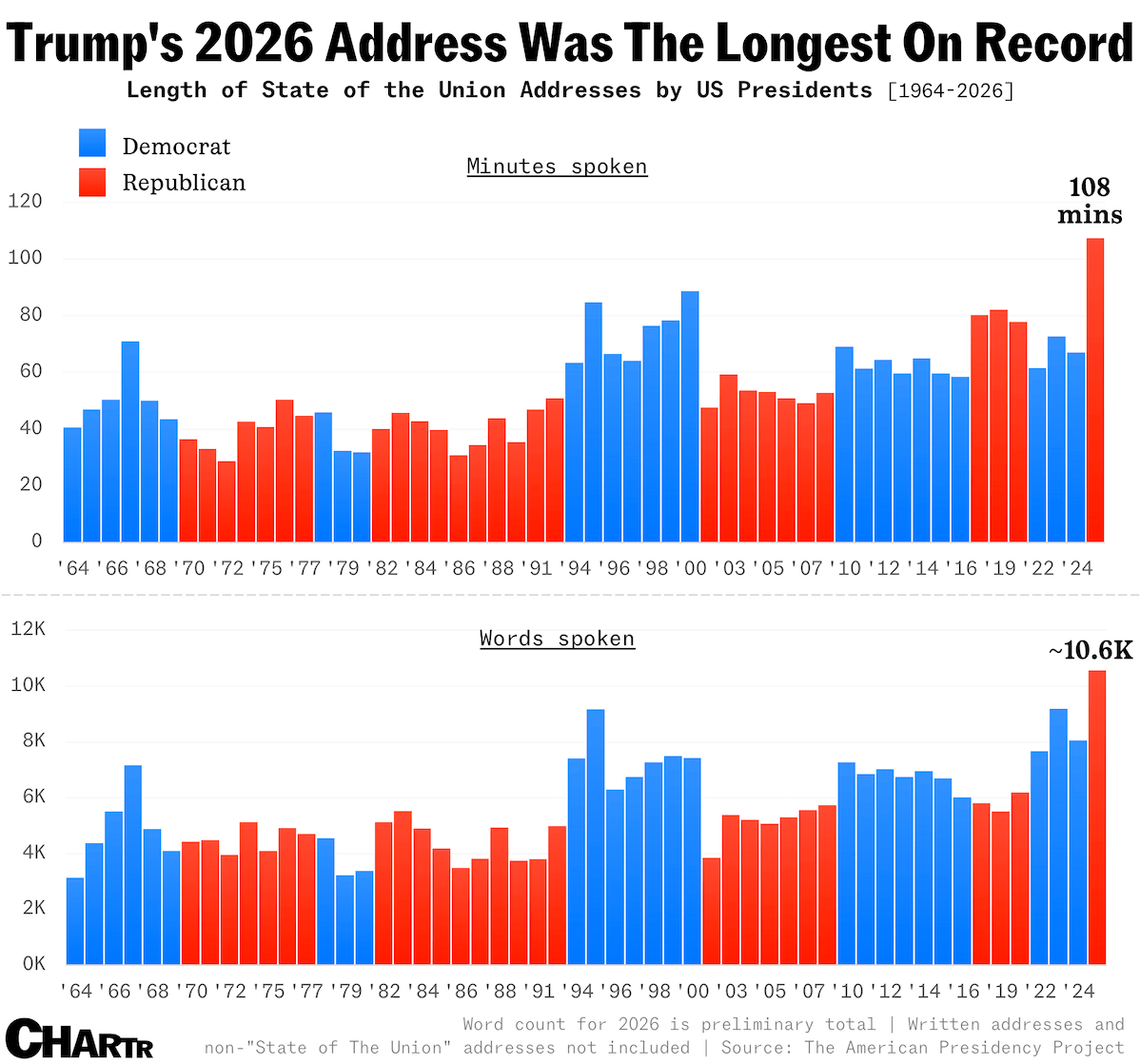 The speech also marked what could be a new personal best in terms of length for Trump, beating his remarks to Congress in March 2025 by 8 minutes, though this was not included in the average as, according to the APP, it was not an official "State of the Union" speech. The APP also calculated a preliminary figure for 2026 in terms of word count, and the current president trumped all other spoken-word SOTU addresses. Some addresses, however, haven't been verbally delivered, and a couple of the written versions have racked up considerably greater tallies — most notably Jimmy Carter's 1981 address, which came in at 33,667 words in total (or about 30 Chartr newsletters' worth). |