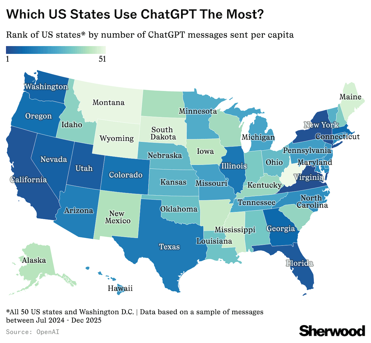 Last Friday, OpenAI launched a new public dashboard tracking global non-enterprise messages on ChatGPT sent between July 2024 and the end of 2025. Of the 118 countries analyzed, the US ranked 25th by number of messages sent per capita, with a little over three quarters of all conversations clustering around just three subjects: practical guidance (~29%), writing (~27%), and seeking information (~20%). But zooming into the data at the state level, it becomes clear that not all regions are using the chatbot in quite the same way. |