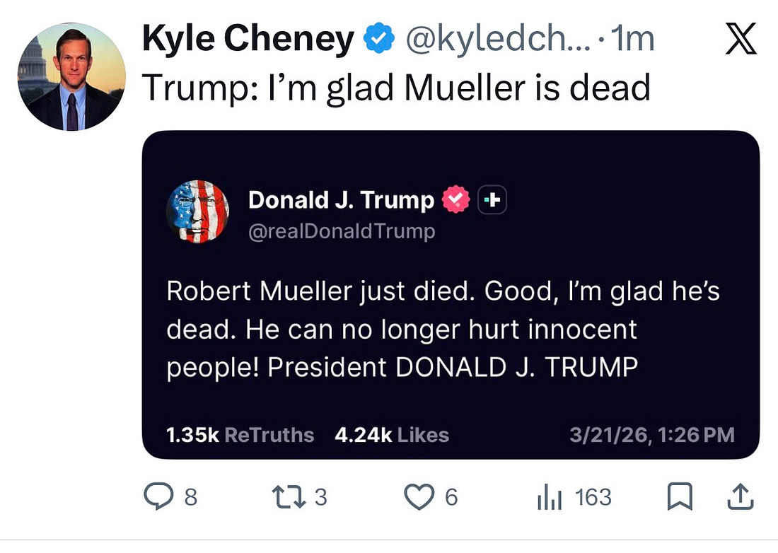 Former Marine, U.S.Attorney, FBI Director and Special Counsel Robert Mueller passed away Friday evening. He was a giant of a man whose commitment to justice and fairness was staunch. I met him for the first time during the investigation into the murder of my Father-in-Law shortly before I went to DOJ. His, was one of the good examples. Every prosecutor who came in contact with him was better off for it. When the Mueller report was finished during Trump’s first term in office, Trump‘s Attorney General, Bill Barr, claimed it was a total exoneration. That, of course, was not the case. Once the entire, albeit redacted, report became available, it was clear that it was a stunning indictment of a sitting president—but one that respected constraints on prosecutors that prevented an actual indictment of a sitting president. It should’ve been a roadmap for Congress to impeach and convict, but they did not take up Muller’s invitation. Trump shared his comments on the passing of an American hero this morning: “Robert Mueller just died. Good, I’m glad he’s dead.” Trump is not a decent person and we should not expect decency from him. Across the country, people who knew and worked with Mueller will be honoring his service to our nation as they remember him. But it’s not just a great man and a loss for the country that we should mourn today. It is also a loss of decency, honor, and integrity. We should have a president who is better than this. We’re in this together, Joyce You're currently a free subscriber to Civil Discourse with Joyce Vance . For the full experience, upgrade your subscription. |