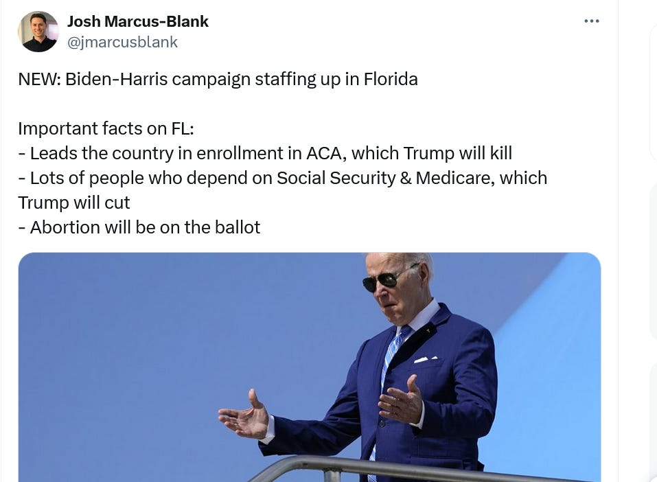 In ever way imaginable, when it comes to the 2024 elections, I would much rather be us than them. Do More, Worry Less and Let’s Get to 55 - Two days after starting Hopium a year ago I posted a new, comprehensive political analysis, Get to 55: Expanding Our Coalition, The Youth Opportunity. Drawing from our strong performance in 2022, I argued this election cycle is one of opportunity for us, one where, due to their escalating extremism, we could imagine growing and expanding our coalition, and “getting to 55%” in the Presidential election. It is a cycle where more possible for us, where we could take things from them, geographically and demographically, and make this election a clear repudiation of the terrible danger MAGA had become. And is what we’ve seen since. We took away a Wisconsin Supreme Court seat in April of 2023, and ended the rancid redistricting there which made the state something other than a democracy. In May we took away Colorado Springs and Jacksonville, two of the largest Republican-held cites in America. We then got to 57% in two Ohio ballot initiative, and took away its six week abortion ban. We then took away the Virginia Assembly from Glenn Youngkin, and did severe damage to the right’s fantasy that a 15 week abortion ban was an escape hatch from Dobbs. We gained seats in New Jersey, Andy Beshear grew his winning margin in Kentucky, and in more than 30 state House and Senate special elections across the US we overperformed our 2020 results by more than 5 points. 2023 was a blue wave year where we made gains all across the country and just repeatedly took things away from them. We are now seeing this same post-Dobbs Dem overperformance and GOP struggle show up 2024 too. We took away that Orlando state house seat in January; took away NY-3, bigly; both RFK and Dean Phillips failed spectacularly against Joe Biden in the primary; buoyed by our grassroots, we are raising lots of money, building a strong general election campaign and more broadly together are building the most powerful political machine we’ve ever had. And Trump keeps underperforming public polling when voters vote; Republicans are struggling to raise money, and the RNC appears broken; there is unprecedented and growing opposition to Trump inside the Republican Party, and his party has splintered; GOP House Members are abandoning ship in droves- literally just quitting and walking away. We are strong and united. They are weak and divided. Joe Biden is a good President, the country is better off. Donald Trump is the ugliest political thing any of us have ever seen. So in this spirit of growth and expansion, we are focusing on three critical projects right now - Biden-Harris, Ruben Gallego and Anderson Clayton and the NC Dem Party. I hope you will give today and tomorrow to help them pad their coffers for the critical end of quarter filing deadline which becomes an important public test of their strength. This community went to work in 2023 in all these elections we discuss above; we worked hard for Tom Keen and Tom Suozzi, this year; and have been working hard for these three projects too. I am making one more ask for we need to stay on offense, keep expanding our map and our coalition, and keep taking stuff away from them. These three places are the most important places I think you can donate too today, and hope you will take a step to help us win and get to 55 this November. Here’s a new Biden ad inviting Haley voters into the nascent, broad, pro-democracy Biden coalition (great to see this ambition and commitment to offense, growth, expansion): Donate to and join the Biden-Harris campaign - This is very important. The general election has begun and it’s time to get on board the Biden-Harris train. Please donate whatever amount you can - $5, $10 - just to get started. So far we’ve raised $177,000 from 2,100 of you for Biden Harris - thank you all! Make an early investment in North Carolina - North Carolina is our most important 2024 battleground expansion state. Please donate today! For more on why I think North Carolina is so important watch my in-depth interview with Anderson Clayton, the dynamic new NC Dem Party chair; learn about the extremists running statewide in North Carolina this year and why they give us a great opportunity to grow, expand and flip NC blue; and hear Anderson give us an update on her work and the impact our investments are having there. So far we’ve raised $136,000 from over 1,700 of you for Anderson and the NC Dems - thank you all! The Biden campaign is using all this early money they are raising to not just try to flip North Carolina but are now making meaningful investments in Florida too - this is what early money can do. Help Ruben Gallego Win Arizona - Join me in helping Ruben Gallego in his campaign to become the next Senator from Arizona. The polls are encouraging there, and this is a very critical 2024 battleground state - must win Biden-Harris state, must win Senate, two House pick up opportunities (and maybe the state house too). Because Senator Sinema stayed in for so long, Ruben is a bit behind where he should be financially and organizationally, and needs our help today. Watch my recent interview with Ruben, and please donate today! We have already raised over $98,000 from over 1,400 of you - thank you all! Spread Hopium - Encourage people in your networks to become a Hopium subscriber. Our goal is to get to 50,000 overall subscribers by March 31st (we’re at 49,000 today), and thanks to all of you we’ve already hit our goal of 6,000 paid subscribers! With your help we can hit our big subscriber goal, keep growing our community, and keep bringing the upbeat, data-filled analysis here to more and more people! ![]() Keep working hard all. Proud to be in this fight with all of you - Simon You're currently a free subscriber to Hopium Chronicles By Simon Rosenberg. For the full experience, upgrade your subscription. |