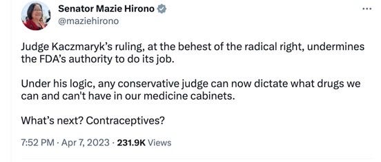 A lot has been written about today’s oral argument in FDA v. Alliance for Hippocratic Medicine, the mifepristone case that was argued in the Supreme Court this morning. Most of the pundits viewed the Court as skeptical about standing—the technical legal issue we discussed at the outset of this case, which requires a party to have suffered an injury that the courts have the capacity to redress before they can bring a lawsuit. The case appeared on our radar screen here at Civil Discourse in April of 2023, when I wrote about the District Judge’s surprising decision that mifepristone, one of two key drugs used for medicated abortion, should be banned despite 20 years of data showing safe and effective usage. I noted that mifepristone has a lower rate of complications than Tylenol. DOJ’s response was swift, filing notice it intended to appeal the decision with the court hours after it was made public. The reason was the scope of the ruling. Although he is in Amarillo, Texas, District Judge Matthew Kacsmaryk entered a nationwide injunction in this case. Had his ruling survived in its original form, it would have banned the drug nationwide. This is what I wrote at the time: “That’s not the legal landscape the Supreme Court said it was creating when it ended 50 years of abortion rights under Roe v. Wade in the Dobbs case. When the Court decided Dobbs, it said decisions about whether and under what circumstances abortion should be legal would be left up to each state. But now, Judge Kacsmaryk has made that decision for all of us—you and me, for our mothers, daughters, sisters, aunts, and friends, regardless of medical necessity or our personal religious and moral beliefs. Judge Kacsmaryk knows best.” I followed it up with this picture, which I believed then and continue to believe now, isn’t too far off of the direction some in this country would like to see us headed. As Hawaii Senator Mazie Hirono pointed out at the time in a tweet, what was next if the FDA’s decisionmaking process for mifepristone was upended? But it was the legal issue that was apparent at the outset of the case, the absence of “standing,” that was the focus of the Court’s argument today. You may recall from our earlier conversations that we aren’t at the merits of the case yet, but rather, the litigation involves whether Judge Kacsmaryk’s decision becomes law while the case is being litigated in front of him or whether it is stayed—put on hold—for the time that takes. The government wants the Court to dismiss the case without permitting any additional proceedings because, it argues, the plaintiffs lack standing. The plaintiff is an organization representing staunchly anti-abortion doctors. Their argument for standing is based on speculation about theoretical possibilities they might be called upon to treat women whose home medication abortions resulted in complications that required emergency room care. As several Justices pointed out, the carefully written affidavits from some of the doctors fell short of establishing that they had ever been called upon to provide care for a women that required them to do what Justice Barrett characterized as terminating embryonic or fetal life. Standing requires that plaintiffs have experienced an actual harm, not a purely speculative one. The doctors were represented by Erin Hawley, a law professor and very capable Supreme Court litigator, who is also the wife of Missouri Senator Josh Hawley. This guy. She was well prepared and skillful at argument and gave the case as good of a hearing as possible, but most of the observers who followed the argument agreed that the Court seems unlikely to rule in their favor. I am one of them. The standing issue is an easy off-ramp for conservative Justices who don’t want to reach the merits of the argument for stay, which requires them to consider, for instance, whether the plaintiffs have a chance of success on the merits. Standing is their way out. The outlier may be Justice Alito, whose abortion jurisprudence has become increasingly untethered from legal principle. When a case is about abortion, he seems to focus only on the desired outcome: putting it out of reach for American women. Justice Alito tipped his hand on this case when it first came before the Court on the government’s emergency “shadow docket” request that it prevent Judge Kacsmaryk’s decision from going into effect while the stay issue was being litigated. The government won, but Justice Alito dissented, even questioning whether the government would obey the Court’s order if it lost the case. It was a preposterous thing for a Supreme Court Justice to say. Doubly so for Alito, who had staunchly defended the FDA decision-making process in an earlier case that involved a Judge weakening the restrictions around dispensing mifepristone. In that 2020 pandemic-era case, a Judge in Maryland lifted the FDA’s requirement that patients receive mifepristone in person at a doctor’s office, ruling that experience had shown in-office visits were unnecessary to safely prescribe the drug. The Supreme Court ultimately affirmed that decision, but Justices Alito and Thomas issued a strongly worded dissent counseling deference to the FDA’s decision making. Alito wrote, “A District Court Judge in Maryland took it upon himself to overrule the FDA on a question of drug safety,” saying the Judge disregarded the court’s guidance against “second-guessing of officials with public health responsibilities.” What a difference a few years and reversed positions of the parties seem to make in Justice Alito’s legal reasoning. In today’s argument, Ms. Hawley seemed to lose most of the other justices, perhaps including even Justice Thomas, because the harm her plaintiffs claim, being forced into procedures against their conscience, seems to be obviated by federal conscience protections, which Solicitor General Elizabeth Prelogar explained to the Court. She