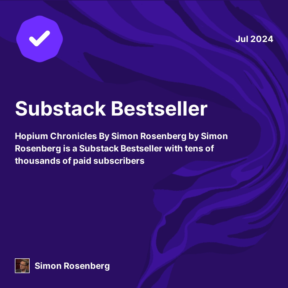 ![]() Finally, I just want to thank everyone here in Hopium land, particularly our paid subscribers. This Hopium project and the community we are building together has been far more successful and meaningful than I could ever anticipated. A few days ago we gained our 10,000th paid subscriber, a big milestone that makes us a Substack “bestseller” - I launched Hopium Chronicles last March because I felt in this time of enormous challenge I needed to do more, to find my highest and best use for our democracy and great country. I had more to give and needed a way to channel it all. Here’s what I wrote on our first day, March 7th, 2023: