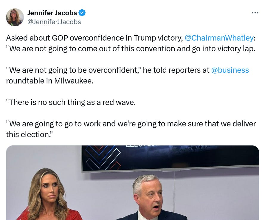 VP Harris released this short video ahead of JD Vance’s speech tonight: We now have a few days of polling after the events of the weekend and the race remains remarkably stable, close and competitive (all polls can be found on 538). Biden remains 2 points down on 538’s average. The Congressional Generic is back in positive territory and has been encouraging for us these past few weeks. Senate polling continues to hold. We’ve had polls this week with Biden up in MI and WI and down just 2 in NC. As we discussed yesterday, JD Vance may be good for Trump’s fundraising, but he is not good for him electorally. The 538 forecast this morning has Biden at 277. Here’s the current battleground in the 538 forecast: Here’s the RNC Chair yesterday saying “there is no red wave.” For there isn’t, and Rs got heavily burned by their bullshit polls and wishful thinking in 2022. The election is remarkably stable, close and competitive, with Trump, perhaps, having a slight advantage. Commentators on television suggesting otherwise are operating outside the data available to us today. From my read over the last few weeks the Trump campaign understands they have a lot of work to do to win. After publicly dissing her they clumsily gave Nikki Haley a Convention speaking slot at the last minute because they don’t have her voters locked up. They’ve kept Trump off the campaign trail because every time he speaks his idiocy, extremism and craziness hurts the campaign. They know that selling a rapist, fraudster, traitor and felon to the American people is no easy thing. They have to lie about Biden’s Presidency because they know how successful it has been - that the economy is booming, the stock market setting records, inflation dropping, crime is way way down and flows to the border are now the lowest they’ve been during the Biden Presidency. They sold the VP pick to Silicon Valley because they needed the money. They’ve tried to bury their extremism and run from Project 2025. They know we’ve won more votes in 7 of the past 8 Presidential elections. They know that we’ve averaged 51% in the last 4 Presidential elections, our best showing since FDR’s 4 elections and that this is a center-left country today. They know they are not at 270 Electoral College votes in current polling. They know that when voters have voted in these last 2 years since Dobbs they keep underperforming and struggling, and we keep winning and overperforming. They know the power of American women and the Democratic grassroots. They know the abortion ballot initiatives could cost them a few critical points in critical battleground states. They know the far right flamed out in the European, French and UK elections. They know NeverTrumpers remain a big threat to their ability to win the election. And they know that the guy who tried to kill Trump is almost certainly one of theirs and a very public confirmation of the threat their radical politics is to the country. From Newsweek this morning (and this has been confirmed by other news outlets):