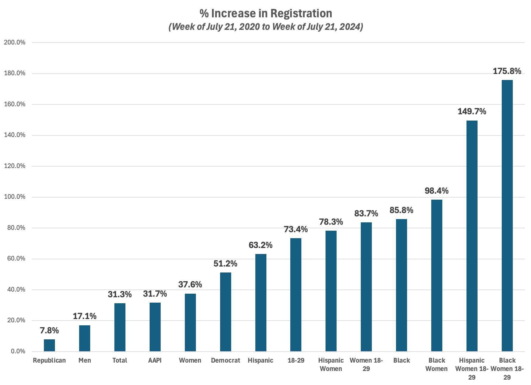 It has been central to our understanding of this election cycle that the Republicans’ doubling down on a losing, extremist politics - MAGA - meant more was possible for us this year than was usually the case. As I wrote in my very first memo this cycle, Get to 55: Expanding Our Coalition, The Youth Opportunity I felt we needed to approach this election with an expansion mindset, go on offense, and strive to take geographic and demographic terrain away from the Rs that was available to us now, particularly since Dobbs. We did this once before as a party, back in the Obama era. In the four Presidential elections prior to Obama’s 2008 run we averaged 47% of the vote. Obama explicitly built his Presidential campaign in 2008 with the intent to expand our coalition, particularly with the fastest growing parts of the electorate, young people and Hispanics. In the four Presidential elections since 2008, 2008 to 2020, we’ve averaged 51% of the vote, 4 points higher than 1992-2004. It’s been our best showing over 4 Presidential elections since FDR’s four Presidential elections from 1932 to 1944. This data is a central reason I keep saying “The Democratic Party is strong” - because we are. In 2022 we Democrats once again reached high, defied history, prevented a red wave from washing across the land, and did something that parties in power seldom do - we gained ground. We picked up a Senate seat, 4 state legislative chambers, 2 governorships. We kept the House close enough to make it far easier to win it this year, and denied Kevin McCarthy ideological control, leading to all sorts of ugly MAGA chaos and dysfunction. We got to 59% in CO, 57% in PA, 55% in MI, 54% in NH. In a year that was supposed to be a disaster for us, we outperformed 2020, an election we won by 4.5 points, in AZ, CO, GA MI, MN, NH and PA. In 2023 and 2024 we’ve continued to defy history, have repeatedly overperformed expectations and polling and have again and again taken stuff away from Republicans. We took away the Wisconsin Supreme seat back in April of 2023 and ended their outrageous gerrymander of the state. We took away Jacksonsville and Colorado Springs, CO, two of the largest Republican held cities in the country. We took away the six week abortion ban in Ohio. We’ve taken away state legislative seats, municipalities, city council and school board seats all across the country. Despite Glenn Youngkin’s big spending, we took away the Virginia Assembly and elected the first Black Speaker in Virginia’s 400 year history. We picked up state legislative seats in New Jersey and Governor Beshear grew his margin of victory in his re-election in Kentucky. We took away NY-3 by a rollicking 8 points earlier this year, and took away Tulsa, Oklahoma last night. Due to their extremism more is possible for us now, and if keep working hard, as we’ve been doing all across the country these last few years, we can keep growing our coalition and keep taking stuff away from them. Vice President Harris and her campaign clearly understand the opportunity that is in front of us now. The pick of Coach Walz was a clear sign the Vice President wanted people from small towns and rural areas, places often hard for Democrats to reach, to feel valued and included in her campaign and Administration. The overt appeal to disaffected Republicans that was so central to the Convention last week was another sign of the Harris campaign’s intent to expand our coalition this year, and take stuff away from them. In my Get to 55 memo I talk about three other potential growth targets for us this year - younger voters, Hispanic voters, and those influenced by Republican abortion extremism (yes there is some overlap here). Well look at what our good friend Tom Bonier has found in the 13 states which have released voter registration data in recent weeks: On Twitter Tom wrote: