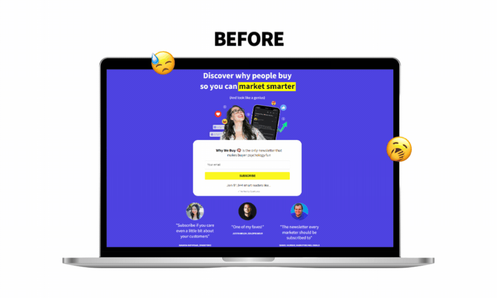 You're not dealing with just organic (re: free) traffic anymore. And you're not f*cking around when the stakes are this high. Clearly, your newsletter opt-in page needs a major facelift. Like immediately. But your regular freelance designer is all booked up. Luckily, you know about Superside—the on-demand design subscription service Amazon and Google use to save their in-house designers 100s of hours each month. In less than 48 hours, Superside's design team blows your mind by delivering not one but TWO versions of your new opt-in page. And they're not just good—they're outstanding. Your Slack DMs start blowing up with messages from awe-struck teammates. What is it about *this* opt-in page that makes it so special? In today's edition of Why We Buy 🧠we'll explore Newsletter Opt-in Pages—how to to craft an opt-in page that's too good to bounce away from. Let's get into it. 🧠The Psychology of Newsletter Opt-in Pages There's an age-old debate in marketing… Some say copy should be written around design. Others say copy should dictate design. But here's a better question… Why not create *both*—at the same time? Your copy can be Ogilvy-level, but if your opt-in page looks like a 5-year-old created it, your conversion rates will likely suffer. One of the reasons is the Halo Effect. People trust and prefer messages that are presented in a visually appealing way. And it's not just limited to the page—it boosts their overall perception of your brand. But don't overdo it. Smart designers blend jaw-dropping designs with clear, compelling copy to make them easy to consume. Then they sprinkle glowing reviews onto the page to not only establish credibility but to also show leads they'll regret not hitting "Subscribe." The result? Even ice-cold page visitors are driven to opt-in. That's why stunning designs built on a foundation of buyer psychology techniques are *not* a luxury for your opt-in page. They're a necessity if you wanna grow your newsletter with people who reply and buy. 🤑 How to Apply This Alright, so how can you craft opt-in pages that drive higher conversions? Social proof Make visitors want to jump on the bandwagon We have a confession: WE'RE the intro story (if you haven't already figured that out). And for our brand-new opt-in page, Superside peppered the page with oodles of social proof. We included testimonials from famous marketers like Amanda Natividad and Justin Welsh, and highlighted other folks saying "Read by top marketers". This helped to clearly identify our target audience and draw them in. Then we feature glowing reviews from readers and continually mention that 63,000 smart marketers are already subscribed. This triggers the bandwagon effect, making others want to join in. For the grand finale, Superside strategically placed logos of well-known brands next to an animated GIF that says "Picture your logo here." This subtly implies that reading Why We Buy 🧠could help your company become the next Apple or Athletic Greens, essentially linking our newsletter with billion-dollar brand success. Smart, huh? Get the Definitive Guide to Digital Ad Design Creating ads that stand out and convert is tougher than ever. Superside is here to help. Discover the best ad practices Amazon, YouTube, and Pinterest are using to stay ahead of the curve. → Download FREE ad guide | | | Headlines Use the power of rhyme to convert every time Studies show that statements that rhyme are 22% more trustworthy than statements that don't. So instead of saying something like "Discover the hidden reasons your customers buy from you," for our revamped value proposition… We tapped into our inner Dr. Seuss and took it one step further… We said "Discover why people buy…" This makes a compelling promise even *more* persuasive. Then Superside maximized the potency by highlighting only those three words so they jump out and grab leads' attention—immediately. Messaging Be clear about the ouchy pains you solve We understand our readers. Why? Because we talk to them. We know people wanna make more money so ultimately they'll have more freedom. But they *don't* wanna resort to the sneaky, scammy marketing tactics that have become so common these days. So throughout our opt-in page, we use PAINKILLER messaging to empathize with the pain visitors are feeling and give them a legit solution. And that's why Superside emphasized this spicy statement: "You deserve to make 'f*ck you!' money (without selling your soul)." Bonus points: Superside created a meme to highlight specific pain points marketers struggle with and then showcased how reading Why We Buy 🧠can help them transform into a better version of themselves. 💥 The Short of It Copy and design work together. If you want to earn your prospect's interest and boost opt-in page conversions, design can't be an afterthought. You've gotta build your newsletter opt-in page on buyer psychology principles to turn leads into readers who reply *and* buy. Just like Superside did for us. Until next time, happy selling! P.S. Wanna *really* get inside your buyer's head? There are a few ways we can help: - Grab your Wallet-Opening Words playbook and make tiny copy tweaks that drive BIG bucks.
