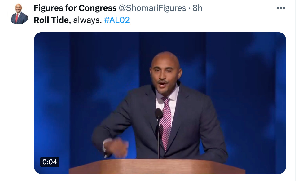 Last night, America got to see one of my favorite people speak at the convention. Alabama’s favorite son, Shomari Figures, is running for Congress in Alabama’s newly configured District 2, the one created when even the Supreme Court took a look at gerrymandering in Alabama saw racial discrimination. In Shomari’s words, Thank you, God Bless you. Roll Tide! We’re in this together, Joyce You're currently a free subscriber to Civil Discourse with Joyce Vance . For the full experience, upgrade your subscription. |