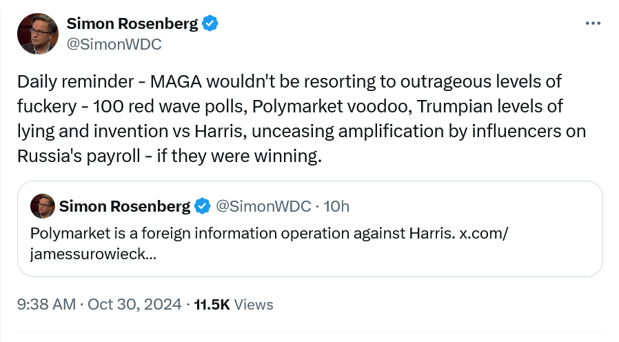 Tom Bonier and I are doing a live presentation on the election tonight at 645pm ET for our Hopium subscribers. If you are a paid subscriber you can register here. If you are not yet a paid subscriber and want to join us subscribe here. Doing More And Worrying Less/Working Hard And Closing Strong In The Home Stretch - 6 days of voting left everyone - let’s keep working it! My one big ask today - donate to and volunteer for Harris-Walz. Beating the fascists remains job 1 today and every day until victory. I want to thank all of you who are self-reporting on all your remarkable work across the country. Postcards, canvassing, back yard phonebank parties - you all are doing the work we need to do to win. For when the Hopium community is called - you answer! Thank you all. Some have asked - are donations this late useful? Yes they are. My advice is that whatever you are going to give this year give it this weekend. The earlier they get the money the more useful it is to the campaign. Late money goes directly into augmenting paid advertising and reaching more voters. So yes it matters. Let’s keep working it people! Harris-Walz, Our Presidential Checkmate States and Wisconsin - Learn more about our “checkmate” strategy, and support Ruben Gallego and these three front-line state parties: