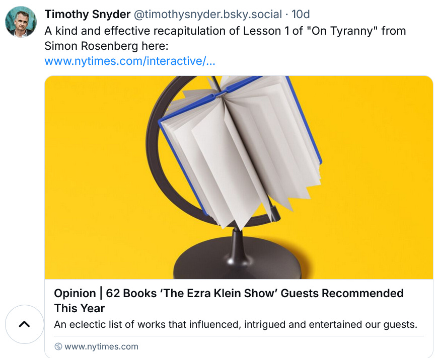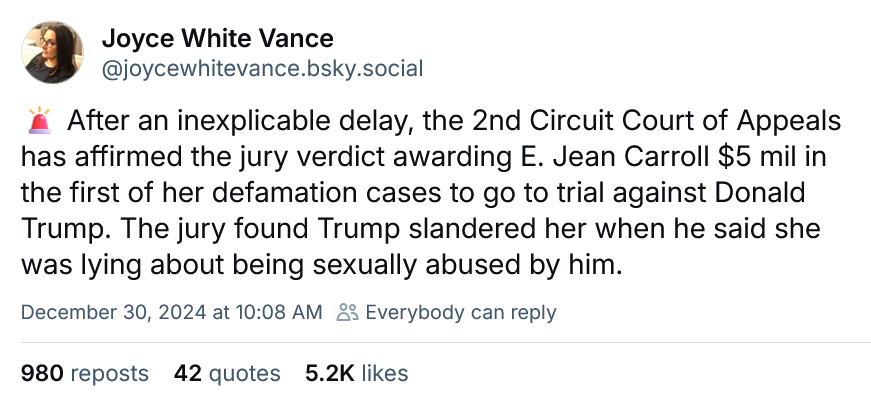 Happy New Year All! In 2025 Let's Take And Celebrate The Wins When They ComeLast day for a Holiday 10% discount on a Hopium paid subscription!Good morning everyone. Happy New Year. Will it be? I think we’ve gotten a taste of what is to come in recent days - Trump weak, reckless, impulsive, and comfortable in chaos, inconsistency, idiocy and hypocrisy. One of my big takeaways from 2024 is how important it is to Trump that he be seen as “winning.” He often began his interviews last year by claiming he was ahead in the polls and winning even when he wasn’t. As I wrote here throughout the general election, the foundation of Trump’s “brand architecture” was that he was winning in the polls and a winner, and Biden then Harris was losing and thus a loser. “Winning” is what makes him a strong man (or strongman). The right dropped over 100 polls in the last few weeks to push the polling averages and forecasters to make it look like he was winning in public polling (which as we documented here he wasn’t) to give him a narrative to bring to late deciding and low information voters that he was winning and a winner. Winning is so important to Trump that he is still arguing that he won the 2020 election. So, in our own work we need to come to understand how important these concepts of winning and losing are to what is about to happen. In opposition, we need to take, celebrate and build on the “wins” when they come. We cannot be perpetually disappointed, somehow turn our wins into losses or dwell on the “weakness” of our side. We are going to lose more than we will win next year, and we have to become psychologically and emotionally prepared for this. The best way to do so, in my mind, is to take and celebrate the wins when they come for when we win in Trump 2.0 we are strong and he is weak. And weakness is the kryptonite of all strongmen. We’ve had early, important wins these last few weeks and he has a series of repeated, almost shocking losses - the Gaetz withdrawal, Trump getting rolled by his own party on the debt ceiling, his further destabilizing of an already unstable Republican House leadership, the fall of Assad and the dramatic weakening of the Russia-Iran alliance, the Fed and the markets raising the alarm about his inflationary economic agenda, his craven capitulation to Musk on H1-B visas and the internal strife it has caused, the embarrassing release of the lurid Gaetz report, and two very important losses in his ongoing trials for sexual assault, defamation and fraud. As I wrote to you yesterday this has been a remarkably bad run for Trump, and it is important we understand this and say so. He is losing, stumbling, f-cking up even before he gets into the White House. He is showing weakness, repeated weakness, and while the public may not see it yet official Washington and his Congressional allies have seen it. He is entering the New Year in a far more wobbly state that we ever could have imagined, and we need to learn how to see and accept him as weak and not allow his own strongman protection of himself become our own. So yes, part of our job in the coming months is to keep pulling back the curtain on the orange Wizard every day, and keep chipping away at his desperate attempt to make the ugliest political thing we’ve even seen look strong and successful. In 2025 we need to take, celebrate and build on the wins when they come, and my friends, the last few weeks we’ve had far more wins than we ever could have expected at this point. It bodes well for next year, and perhaps it will be a happier year than we had any right to believe a few weeks ago. But as I like to say, we will only keep winning if we stay engaged, and keep doing the work. Remember - Trump is not a strong man, he is a weak man. He remains a serial assaulter of women, fraudster, traitor, 34 times felon and the ugliest political thing we have ever seen. We cannot let his projection of himself onto the world become our own. For more on where we are and where we go from here check out my recent post and video, The Trump Wrecking Ball Is Already Here, More Notes On The Path Forward, and my recent interviews with thought leaders and change makers like Ruben Gallego, Abigail Spanberger, Ben Wikler and Ken Martin. Enjoy this remembrance of Jimmy Carter from his biographer, Jonathan Alter. Today is the last day to get 10% off an annual Hopium paid subscription. These paid subscriptions keep this place going and the Hopium flowing so please consider signing up today! Finally, I end the year with what was a small but meaningful moment for me a few days ago. I got a Bluesky shoutout from my life teachers and heros, Timothy Snyder: In my sit down with Ezra Klein for his podcast earlier this year Ezra concluded our discussion, as he does all his discussions, asking for book recommendations. Here is what Ezra included for me in his fascinating year end compendium of book recommendations from his guests (gift link). It is a reminder that here at Hopium we do not obey in advance yesterday, today or tomorrow: Keep working hard all. Proud to be in this fight with all of you, and here’s to making 2025 better than any of us could have imagined a few weeks ago - Simon You're currently a free subscriber to Hopium Chronicles By Simon Rosenberg. For the full experience, upgrade your subscription. |