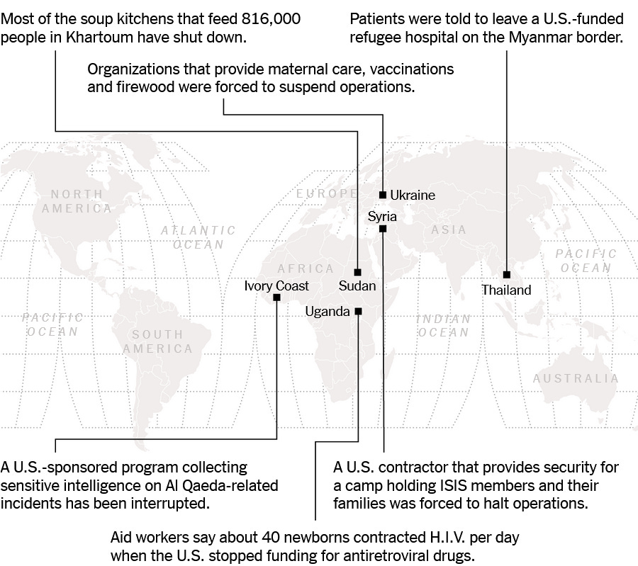 The savage treatment of the migrants we are sending back, the bullying of countries to accept them, the levying of tariffs on our closest allies, the threat or actual seizure of land from sovereign nations/allies will turn America into a rogue nation, a pariah state, and make us a far less safe and successful nation. Life Saving Aid Programs, Medical Research, Clinical Trials, Public Health Programs Are Still Turned Off - It’s possible that the most dangerous actions Trump has taken so far involve a wide array of programs whose funding remains stolen/frozen. Here is a new NYTimes story today that suggests the cut off of foreign aid programs could result in millions of people dying around the world in the coming months, How The World Is Reeling From Trump’s Aid Freeze: