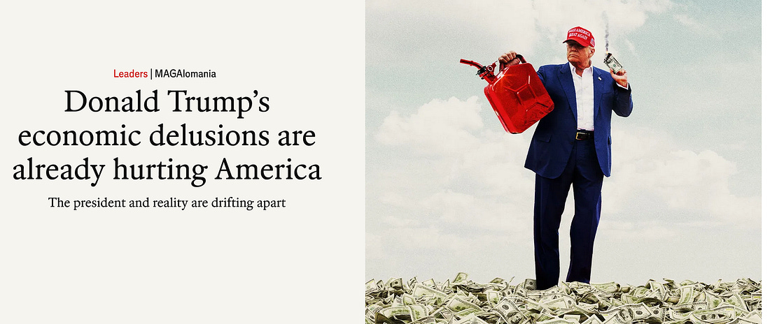Let’s return to this image from the Economist earlier this month and it’s companion article, Donald Trump’s economic delusions are already hurting America. In this image Trump is not only lighting dollars and our prosperity on fire, he is lighting himself on fire too. All of this why we need to be on offense now, be loud and keep working hard. While we are doing more outside, in public, we cannot stop contacting our Senators and House Members. We can and must do both as Congressional offices will note the fall off in contacts and read it as our movement is easing up, slowing down. And we just cannot have that, can we?????? Loud and proud people, loud and proud!!!!!!!!!!!!!!!!!!!!!!!!!!!!!!!!!!!!!!!!!!!!!!!!!!!!!!! Recommended Hopium Actions and Campaigns - While we have made many recommendations to Democrats in recent months for how to raise our game and fight harder and smarter, let’s focus on our current three recommended sets of actions for how we can best channel our love of country and our frustrations into concrete action today in addition to what we discuss above: 1 - Fight The Trump-Musk Attack On Our Government, Our Privacy And Our Constitutional Order - Encourage your Senators and Representatives to let Facts be be submitted to a candid world in a joint Senate-House Letter to America; to hold their own hearings; to file criminal referrals for Musk and his malicious posse to DOJ/FBI and amicus briefs in the court cases regarding the usurpation of their Constitutional authorities or file suits of their own (House Dems began doing this several weeks ago). Encourage them to hold a daily morning press conference to more aggressively challenge Musk’s ransacking of the USG that is making America less prosperous, less healthy, less safe and far less respected in the world. 2 - Loudly Protest Trump’s Embrace of Russia and Abandonment of NATO and Europe - Let your electeds know you are outraged by traitorous Trump’s selling out of Zelenskyy, abandonment of Europe and embrace of Putin; and that we cannot accept this level of appeasement of someone who is a clear enemy of America and the West, and certainly not an ally. Demand that Trump not let his Saudi meeting w/Putin become our Munich; demand that he not become our Neville Chamberlain; demand that we rejoin our European and NATO allies in support of Zelenskyy and democracy here and everywhere. The country is not with Trump’s embrace of Putin and we must be very loud, very, very loud now. See my new essay on the need to support our allies and not surrender to Putin, and my new interview with Rep. Adam Smith, the Ranking Member of the House Armed Services Committee, one of the most important foreign policy voices in our party. Part II - do all this and demand that Hegseth and Gabbard resign. Hegseth is obvious. He sent war plans on an insecure chat and simply can no longer be trusted. Gabbard for she is in charge of intelligence for the US, and must take responsibility for participating in and not stopping one of the most significant security breaches in US history. 3 - Our Work In The States, The Spring Offensive - I am going to rework this section in the next few days as so much has happened since we called on our community members to organize in the 17 most vulnerable Republican House seats. Rallies and protests have exploded across the country. The DNC/House Dems/State Parties have kicked off People’s Town Halls in all 50 states. I have come to believe that we should be leaning on our state and local electeds to pursue these organized “condemnations” of the Trump regime and their betrayal of America. Let’s start talking now about what we are going to do on July 4th, a day with all of a sudden much more importance. Paid subscribers should self-report their actions today in our daily chat. So inspired by how hard so many of you are working. I want to make a special plea to all Hopium readers in states with Republican Senators - please make your calls, every day. Even 50 to 100 people calling every day in every red state can make a difference. We have hundreds of Hopium subscribers in every state in the country and it’s critical that we all do our part now. Keep working hard all, and let’s make this a big day for our freedoms, our families and our future! - Simon You're currently a free subscriber to Hopium Chronicles By Simon Rosenberg. For the full experience, upgrade your subscription. |