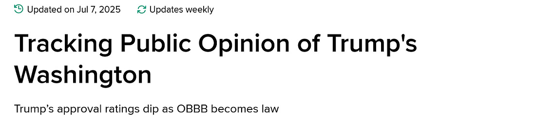 All four of these events will be recorded and shared here for those who can’t make them live. If you haven’t gotten to them yet be sure to review my first two “what’s next” essays here and here. We got our first post-big ugly poll from Morning Consult last night. While this poll has been one of the better polls for Trump note their headline this week - “Trump’s approval ratings dip as OBBB becomes law.”