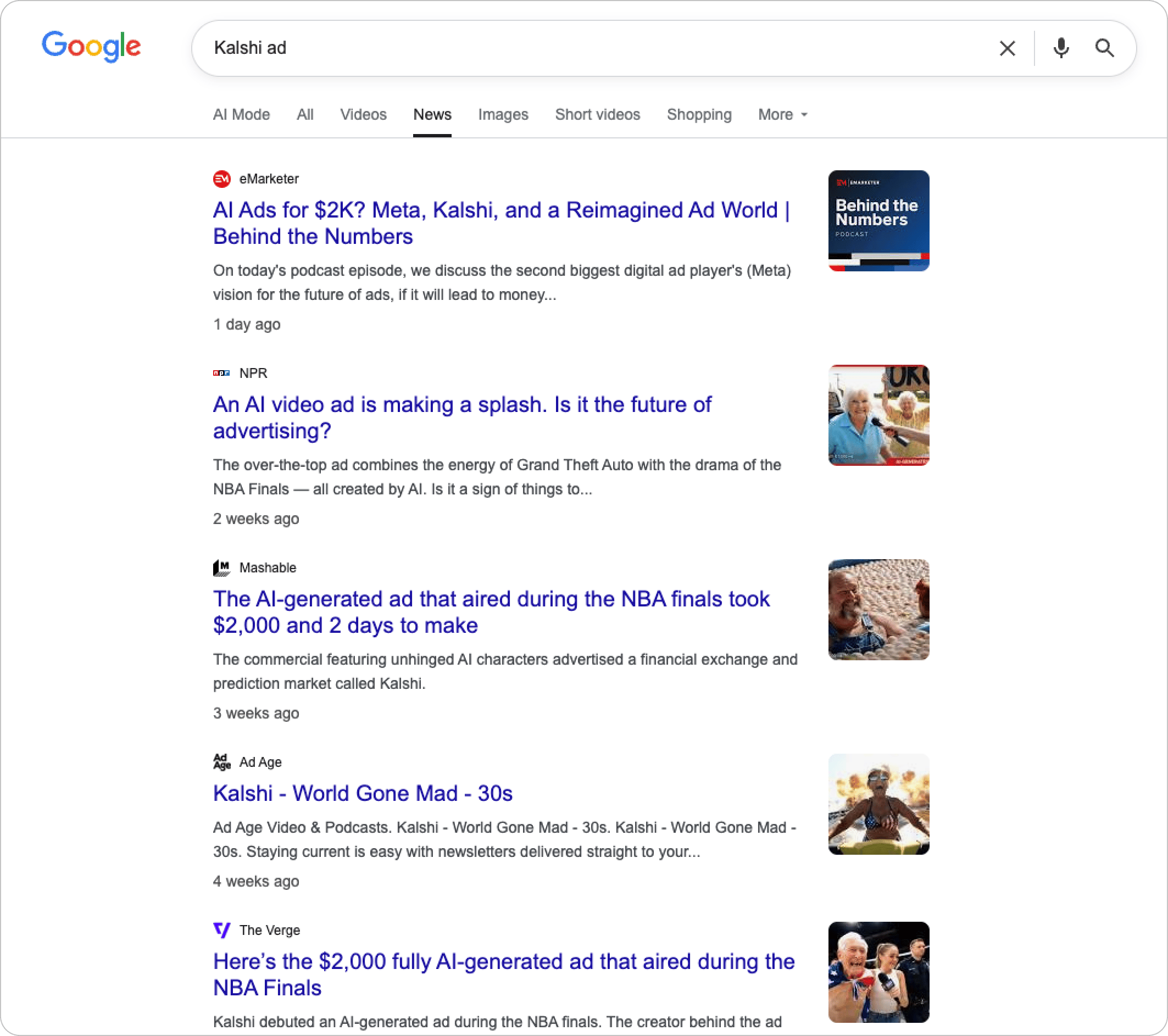 You can debate the quality of the ad (and point out that it clearly looks AI-generated), but you can't debate the earned media coverage and economic efficiency of the spot. Just search "Kalshi Ad" on Google and you'll see the splash of earned media attention the ad generated.