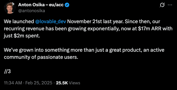 Unlike most startups, Lovable never had to worry about scraping together cash, due to a sizable $7.5M pre-seed followed by an explosion of early revenue traction. Lovable launched on November 21st 2024. By February 2025 (3 months after launch), they had: