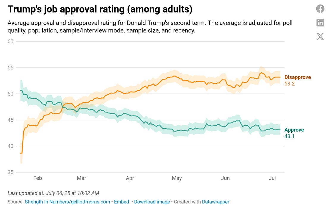 Sunday Hopium - Grateful To Be In This Community With All Of YouRest up peeps. We have a lot of work ahead of us......Happy Sunday all. Here at Hopium Sundays are rest days, reboot and recharge days. Take long walks, read that book that has been sitting on your bed side table for months, hang with old friends somewhere cool days. Took this photo of my great summer project, my street garden, this morning. It is coming along! Think I am going to start calling it my Victory Garden from now on. A few additional notes on this warm summer Sunday from DC….. First, gratitude. I am grateful to be in this community of proud, plucky patriots in this challenging time for our country. Your actions, your grit, your can do spirit, your insights that flow all day and night long in our Hopium chat keeps me buoyed, inspired and motivated to keep fighting. Hard to put into words how important all of you have become to my own journey and work and I am just profoundly grateful to be in this fight with all of you. We have done a lot of good here, together, over the past two years but yes it does feel like our most important work lies ahead of us, not behind. Second, some Hopium homework. If you haven’t yet please read The Declaration of Independence, Lincoln’s Gettysburg Address and a third one for this July Fourth holiday - FDR’s extraordinary Four Freedoms Speech. They are powerful reminders of who we are, and will be, again. Next, the info wars. I have been thinking a lot about a meme that has been running through our communities - that Trump is acting as if there will not be an election in 2026 or 2028. I have come to believe that this is not quite right, that it is something else. I think he has confidence - overconfidence, arrogance, authoritarian delusional fantasy - of his ability to control the information space and make it bend the knee to him (and thus win in 2026). Some of this confidence/arrogance comes from his overcoming his convictions and his attack on the Congress to win last year; some comes from the enormous sums of money he has raised and will deploy in our elections; some from our own weakness and tepid response so far to him, and his belief in the superiority of his political team; some from the way the mainstream media has in fact distressingly bent the knee to him, even making direct protection racket type payments to him personally. He has come to believe that he and his team now have the power to determine what is true, and that we/the media/reality are no match for his POWER and STRENGTH. That basically it doesn’t matter what he does or whether his Administration is succeeding for he will proclaim that he is SUCCEEDING, WINNING AND ALL IS GREAT and thus it will be so. And with the support of the right wing media machine, the power of the American Presidency, and the antiquated bothsiderism of what’s left of legacy media many times it will in fact be so. Think about what we have heard in recent weeks. The big ugly bill doesn’t cut Medicaid. Won’t increase the deficit. That it is the most popular legislation in history. That it will create 3-4% growth, and the tax cuts will pay for themselves. Or that the tariffs are not raising prices on Americans. Or that the Iranian nuclear program was OBLITERATED!!!!!!!!!!!!!!!!!!!! Or that the 10-15m undocumented immigrants in the US are all criminals and gang members. Or that it’s Joe Biden’s fault all those young girls died in Texas this weekend. Or that Russia did not interfere in the 2016 elections, and Biden and his team stole the 2020 elections. That the economy was bad under Biden. That DEI is crippling America. Or that Putin wants peace. Or that everything that’s bad is Joe Biden’s fault, expect of course for those things that are Obama’s fault. Or that Dear Leader is popular, virile, successful, thin, tall and handsome. It’s all a show. A world of Orwellian fabrication, illusion and lies, completely disconnected from and unconcerned with truth. Or perhaps more accurately at war with truth. In our discussion last week Anne Applebaum refereed to it as a “spectacle of power.” And its why the Administration is attacking all sources of independent truth like our universities, our research institutions, legacy media and perhaps even starting to game government statistics - for they must maintain The Fiction and fanatical understandings of their extremist politics at all costs. Something I have come to believe is that one of the central ways that Trump and his team are keeping Congressional Rs on board is by the flood of fake polling that I’ve been talking about for the last several years. In our polling, the polling in the real world, Trump is unpopular, failing and his 2024 coalition unraveling. In his polling world he is popular, successful and even growing his vote. G. Elliott Morris wrote about the presence of these right-aligned pollsters this week. Using data from his site, Strength in Numbers, Trump’s job approval right now stands at 43%-53% (-10). Here are some polls from the right-aligned Dear Leader/red wave pollsters of late: