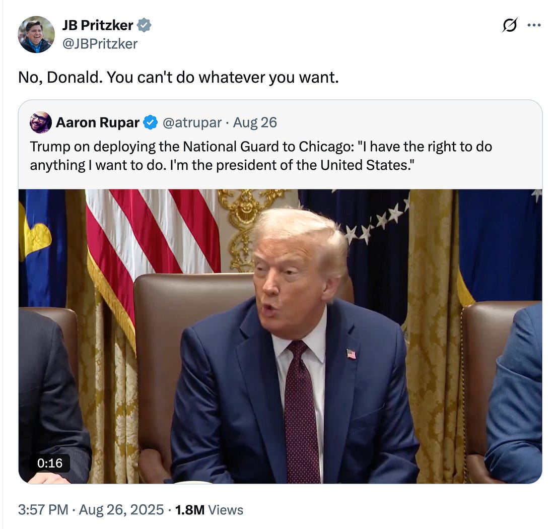 Trump continues to pursue an imperial presidency. During a cabinet meeting on August 26, 2025, Mr. Trump said, “I have the right to do anything I want to do,” in response to a question about deploying the National Guard to Chicago without Governor JB Pritzker’s approval. That statement seems to reflect his overall assessment of his power as president, fueled by a Supreme Court that has said he is virtually unaccountable for even criminal conduct committed while in office. Trump made similar statements about presidential power on multiple occasions during and after his first term in office. For instance, in July 2019, he told participants at a summit for teens, “I have an Article 2 where I have the right to do whatever I want as president.” Governor Pritzker pushed back on X: “No, Donald. You can’t do whatever you want.” Last week, the courts agreed, for the most part. This week, we head back to the courts for more. Missouri Gerrymander Missouri’s Republican Governor, Mike Kehoe, is bringing lawmakers back to the state capitol this week so that they can, Texas-style, gerrymander another Republican seat in Congress, per Trump’s orders. The legislature will also debate placing a constitutional amendment on the 2026 ballot to make it more difficult to use Missouri’s initiative petition process to amend the state’s constitution. “This is about clarity for voters and ownership of our future,” the Governor said. There is sure to be litigation; the only question is when. Deportation of Unaccompanied Guatemalan Children. Late Saturday, lawyers at the National Law Immigration Center, along with the Young Center for Immigrant Children’s Rights, filed a complaint on behalf of 10 juvenile plaintiffs between the ages of 10 and 17. On Friday, according to the complaint, “several media outlets reported that Defendants [federal agencies and officials] are planning to imminently remove hundreds of Guatemalan unaccompanied minors to Guatemala.” Congress created a special statutory scheme to ensure that, because of their vulnerability, unaccompanied minors receive enhanced protection and care whenever the government seeks to remove them from the United States. The plaintiffs argue that summary removal plainly violates this statutory scheme. Once a child is designated as an unaccompanied minor under 6 U.S.C. § 279(g)(2), there are numerous legal protections to ensure they receive due process and can pursue any form of relief from deportation they are eligible for. The complaint alleges that, “Defendants have not provided notice to unaccompanied minors subject to summary removal and have not provided them an opportunity to contest their summary removal … Defendants have simply removed minors’ pending cases from the immigration court docket in preparation for their summary removal.” The complaint sought an injunction on behalf of the 10 individual plaintiffs in the case and asked the judge to certify a class (the result of last term's Trump v. Casa case, in which SCOTUS put an end to the use of nationwide injunctions to prevent challenged deportations), as well as other relief designed to prevent the children from being summarily deported. The plaintiffs alleged the government’s actions violate: