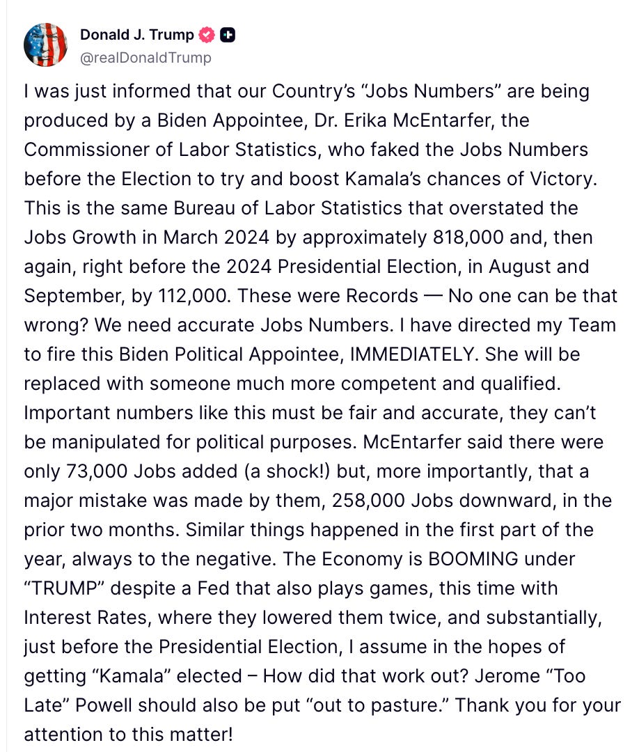 Friday, Donald Trump did what every good (bad?) dictator does: He shot the messenger. The monthly jobs report showed just 73,000 jobs in July, with big reductions to May's and June's numbers, so Trump fired Bureau of Labor Statistics Commissioner Erika McEntarfer, casting aspersions on her in a social media post, calling her a “Biden appointee” and claiming, falsely, that she played games with the numbers. The message to every single government employee is clear. If the numbers, the outcomes, or anything else look bad for Trump, fudge it or risk losing your job. It’s all about personal loyalty, which comes as no surprise to anyone who has been paying attention. Still, this is 1984-level stuff. McEntarfer is an economist, a data person, with a Ph.D. The New York Times reported that she had broad bipartisan support when the Senate confirmed her to the position in 2024 in an 86-8 vote, which included yeas from then-Senators JD Vance and Marco Rubio. She had worked in the Census Bureau during both Republican and Democratic administrations for 20 years before going to Treasury. That’s not the resume of an ideologue. But Trump doesn’t care about people who’ve worked hard to build their careers as public servants. He just wants to look good, whether he’s doing good or not. So McEntarfer had to go. If you’ve already started reading George Orwell’s 1984 for our book club this month, this story really resonates. Our timing with reading the book is impeccable. It’s almost as though Trump is reading the book too, but reading it as a guidance manual, not a cautionary tale. The Washington Post reported on Thursday that “The Smithsonian’s National Museum of American History in July removed references to President Donald Trump’s two impeachments from an exhibit display. A person familiar with the exhibit plans, who was not authorized to discuss them publicly, said the change came about as part of a content review that the Smithsonian agreed to undertake following pressure from the White House to remove an art museum director.” Rewriting history is Orwellian to the core. Breathtakingly, shockingly so. The fact remains that even though the Senate refused to convict on either occasion, Donald Trump was impeached twice, the only president that has happened to during a single term in office. The first time was for attempting to use much-needed security aid that Congress had voted to send to Ukraine as a quid pro quo to obtain an announcement from that country’s brand-new leader at the time, Volodymyr Zelenskyy, that Joe Biden was under investigation in that country for corruption. The second impeachment was in connection with January 6. That is the history of our nation, which nothing can change. But in the novel 1984, facts are not a barrier. Rewriting history is a central tenet of the totalitarian regime, carried out by the Ministry of Truth. I won’t spoil it for you if you haven’t read that far yet, but life seems to be imitating art right now, and it’s a compelling sign that Trump does not mean to limit himself to the powers the Constitution assigns to a president. This is a time to be driving that point home with friends who still haven’t caught on, and we are going to have a lot to talk about as we read the book. I’m signing up some great guests to join us throughout the month. But there’s a little good news, or at least a silver lining in this. The Washington Post reported that following its story, the Smithsonian issued a statement that said, “a future and updated exhibit will include all impeachments.” Their excuse for why the removed mention of Trump for an exhibit that referred to the impeachments of Bill Clinton and Andrew Johnson, along with a mention that Richard Nixon would have been impeached had he not resigned, was nonsensical: “Because the other topics in this section had not been updated since 2008, the decision was made to restore the Impeachment case back to its 2008 appearance.” But it’s plain that coverage by the press and outrage by the media still matter. So, as Trump prepares to erase the truth and write his own version of the country’s past and present, our job is to stay informed and express our anger and disgust. Orwell wrote, “He who controls the past controls the future. He who controls the present controls the past." Trump controls the present and is trying to change the past. He’s also, as with the Bureau of Labor Statistics, trying to change the present in hopes he can continue to control the future. It’s a dark moment. When Trump took control of the Kennedy Center, firing the Board and appointing himself, art and theater fought back. If you haven’t seen it already, watch “One Gay More.” We can all fight back, too. Trump’s efforts to change the past and the present are transparent, and the right answer is the one these artists took: to make fun of it, to laugh at it, to ridicule it, and to ridicule the man who thinks we will fall for it. Today it’s jobs numbers; tomorrow it will be the Epstein files or whatever else Trump fears at the moment. Let’s be loud. There are no alternative facts when it comes to American history. Share your thoughts! We’re in this together, Joyce. You're currently a free subscriber to Civil Discourse with Joyce Vance . For the full experience, upgrade your subscription. |