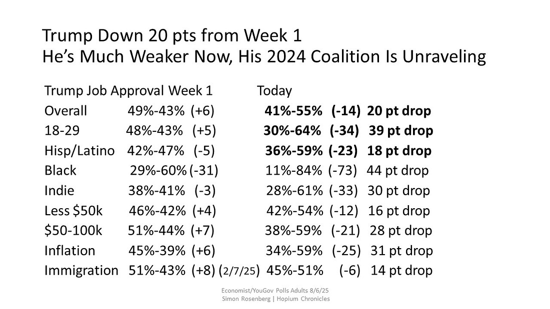 Our updated fundraising goals are now for the end of the year, December 31st, except for the 2025 races, which are now for Election Day, 2025. We can do this people!!!!!!!!!!!!!!!!!!!!!!!!!!!!!!!! Our Recommended Actions - We are prioritizing three actions today. You can get our full list of recommended actions here. Let’s get to it: 1 - Call your Senators and Rep To Demand They Rescind Trump’s Terrible Tariffs - Congress simply must take back its tariff authority that Trump has illegally and unconstitutional seized and dangerously abused. It is time now for to rescind these terrible and destructive madman tariffs. 2 - Bring “Resolutions Of Condemnation” To Your Community - Inspired by the tactics of our Founders learn about how Hopium members are advancing “Resolutions of Condemnation” in their communities across the country and consider bringing this initiative to your state, country or city/town. Remarkably, members of this community are now advancing 50 resolutions projects in 20 states. Can we get to all 50 states by the fall election? Our newly updated Resolutions page includes a new chat for folks to report in on their progress or seek counsel from those interested in launching a resolutions project in their community. This is one way to fight back against Trump’s unprecedented abandonment of our Constitutional order. 3 - Grow Hopium And This Wonderful Community Of Proud, Plucky, Patriots - We’ve set a goal of trying to grow the Hopium community from the 152,000 we are now to 175,000 by Election Day, 2025. Do what you can to encourage your friends, family and colleagues to become a summer subscriber to Hopium, free or paid. If each current paid subscriber brings in just one new subscriber this summer we will hit our goal. To encourage the growth of our community annual paid subscriptions are 10% off through Labor Day. Use that link to buy gift or group subscriptions, and join our new referral rewards program too. Finally, please self-report your activities to our daily paid subscriber chat. These reports help inspire all of us to do more and fight harder! Been impressive to see how many of you remain involved in local, in person protests of all kinds in your communities. Keep it up!!! Keep working hard all. Proud to be in this fight with all of you, and a fight it truly is - Simon You're currently a free subscriber to Hopium Chronicles By Simon Rosenberg. For the full experience, upgrade your subscription. |