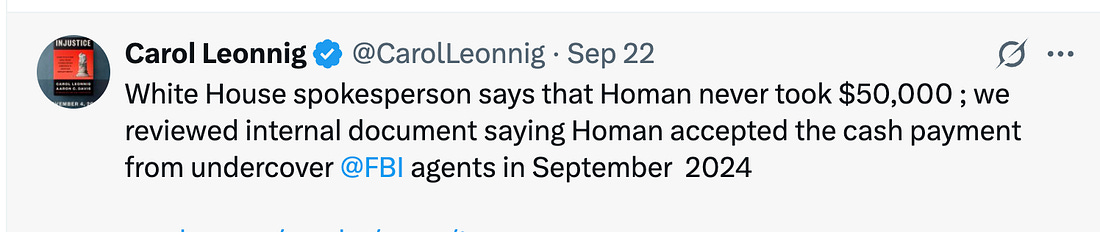 MSNBC’s Carol Leonnig and Ken Dilanian reported over the weekend that in “an undercover operation last year,” Trump’s braggadocious border czar Tom Homan was recorded by the FBI “accepting $50,000 in cash after indicating he could help the agents — who were posing as business executives — win government contracts in a second Trump administration.” The reporters spoke with multiple people familiar with the probe and were able to review internal documents. In November of 2024, Homan told a conservative convention “Trump comes back in January, I’ll be on his heels coming back, and I will run the biggest deportation force this country has ever seen. They ain’t seen shit yet. Wait until 2025.” In January on the eve of Trump’s inauguration, Homan addressed people who were in this country without legal status, saying, “So if you're in the country illegally, you got a problem.” In an April speech to the Arizona legislature he said, “If you’re in this country illegally, you should be looking over your shoulder. It’s not OK to enter this country illegally — it’s a crime.” In July, Homan stated that the Trump administration will grant "no amnesty" to undocumented farmworkers, condemning businesses that “knowingly break immigration laws.” Homan doesn’t seem to have the same tough on crime views when it comes to his own conduct. Fox News Host Laura Ingraham asked him about it on Monday: “Tom, I wanna give you a chance to address this article that came out over the weekend. It was on our always reliable MSNBC, and they said that you took $50,000 in cash in a bag from an undercover FBI agent to help them win government contracts in Trump’s second term.” She continued, “The DOJ said they concluded there was no criminal wrongdoing, but nevertheless, that story is out there, and I imagine you want to respond to that.” Homan only dug himself in deeper. He responded, “I did nothing criminal. I did nothing illegal,” but he notably didn’t deny accepting the $50,000 in cash or that the cash was payment for his promise to steer federal border contracts to undercover agents posing as business executives. He continued, “Tom Homan isn’t going anywhere, Tom Homan isn’t shutting up, and Tom Homan’s gonna keep doing what he’s doing because working with President Trump is the greatest honor of my life. We’re making this country safer again every day, and we’re gonna keep doing it.” None of that is a denial of the reporting. Homan never said he didn’t take the money, the instinctive reaction you would expect of someone falsely accused. White House Press Secretary Karoline Leavitt later denied that Homan took the bribe money, but that raises even more questions. This was an undercover operation, which means that there would be tapes. That’s standard protocol where possible. And Carol Leonnig was quick to defend her reporting, tweeting that the investigative file reflects that Homan accepted the money. If the White House has it right, there’s an easy way to confirm it. The case is closed. They can release the investigative file, including the tapes. The agents involved could explain what happened. Perhaps there is some legitimate confusion. The White House could easily clear that up if so. But the story has been in circulation since Saturday, and that hasn’t happened. Maybe the Homan file is with the Epstein files? The most likely charge that the Justice Department would have been investigating here is 18 U.S.C. 201, bribery. That statute provides that: “Whoever… being a public official or person selected to be a public official, directly or indirectly, corruptly demands, seeks, receives, accepts, or agrees to receive or accept anything of value personally or for any other person or entity, in return for: (A) being influenced in the performance of any official act; (B) being influenced to commit or aid in committing, or to collude in, or allow, any fraud, or make opportunity for the commission of any fraud, on the United States…” It applies to people who have been selected to be public officials, as well as to those who already are, but it would make sense to permit the investigation to continue after Homan entered government service, to build the strongest case possible. What doesn’t make sense—what smacks of the kind of impropriety we’ve been seeing from this Justice Department—is prematurely terminating the investigation and closing the case without taking an action. MSNBC reported that agents planned to wait and see what Homan did once he went to work for the government but that the case “stalled” after Trump became president and was formally closed in the last few weeks. The investigation was out of the Western District of Texas, handled by that U.S. Attorney’s Office with help from the DOJ’s Public Integrity Section. (The Section was effectively dismantled after an incident involving the dismissal of a public corruption case against New York City Mayor Eric Adams. The dismissal, which the administration insisted on in exchange for Adams’ agreement to cooperate with their immigration deportation policy, resulted in resignations at both the U.S. Attorney’s Office in the Southern District of New York and at Main Justice.) In the meantime, there’s the question of where the $50,000 is. Did Homan keep it? What did he do with it? If the agents kept it, that too would be reflected in the case file. If it stayed with Homan, failing to report it on his taxes would be a separate federal crime from possible bribery. Like prosecutors always say, follow the money. Any other president would have immediately fired someone in Homan’s position, but Homan still has Trump’s full support. Thanks for being here with me at Civil Discourse. Your subscriptions make the newsletter possible, and I appreciate you. We’re in this together, Joyce You're currently a free subscriber to Civil Discourse with Joyce Vance . For t
