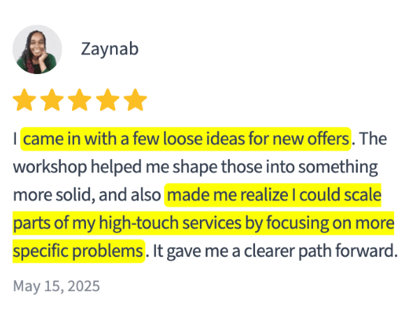 | Feeling trapped in the feast-or-famine cycle of custom client work? I used to be in your shoes. Back in 2013, I had a branding agency that was reeling in awesome clients like Target and Holiday Inn. But I was tired of the custom work hamster wheel and dealing with unrealistic client demands. So I committed to building a tech company that I thought would be amazing. Fast forward 18 months… I'd raised venture capital, launched our platform, and attracted 1000s of users from around the globe. Plot twist: We built the wrong product for the wrong people, ran out of money, and I ended up filing personal bankruptcy. 🫠 That failure taught me the most expensive business lesson of my life: You can't build what YOU want to sell and hope people buy it. And since generating more than $1.8 million from just 4 digital products in 2 years, I learned the key difference in designing profitable offers isn't some B.S. marketing "hack" or "secret." (You already know those are bogus.) Success in business means knowing which *problems* buyers will pay to make disappear, then designing your offer around them. That's exactly what my Offer Breakthrough workshop shows you how to do… in just 4 hours. Whether you want to create a new offer or repackage your services so more people buy… You'll use my proven 9-step "Problem-Up" method to design a scalable offer that buyers will happily pay premium prices for—without all the typical overthinking or self-doubt. Here's the nitty-gritty on how it works: - Attend two live 2-hour workshops split evenly over 2 days (September 30th and October 7th) - get real-time guidance from me and complete the work during our sessions (instead of possibly buying another resource that sits unfinished)
