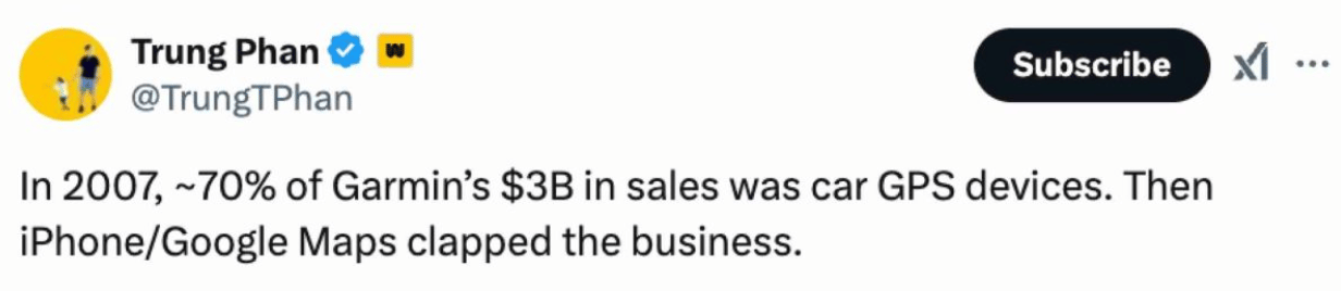 Now imagine you're working at Garmin in early 2007 (before the launch of the iPhone and Google Maps app), and you're focused on the car-friendly GPS systems that comprise about 70% of your business.