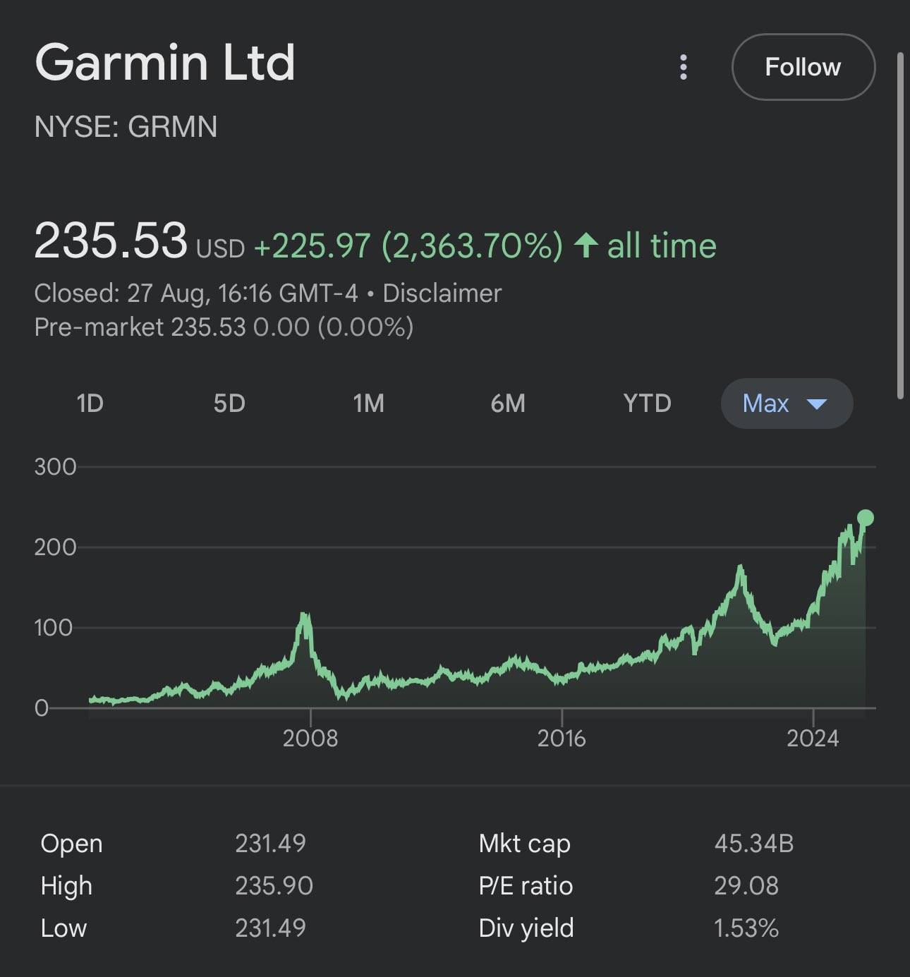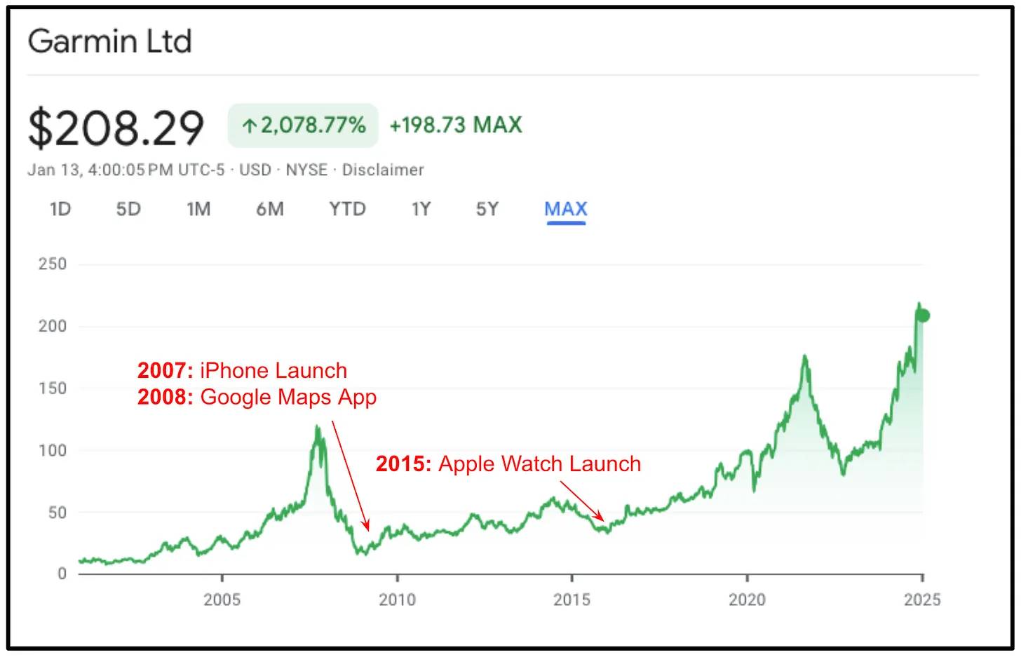 Garmin's stock, which saw a huge pop after the success of the nüvi, plummeted in 2008. The combination of smartphones eroding its market share and the 2008 financial crisis combined to form the perfect storm. The car GPS had basically become a relic as quickly as it had risen to prominence.