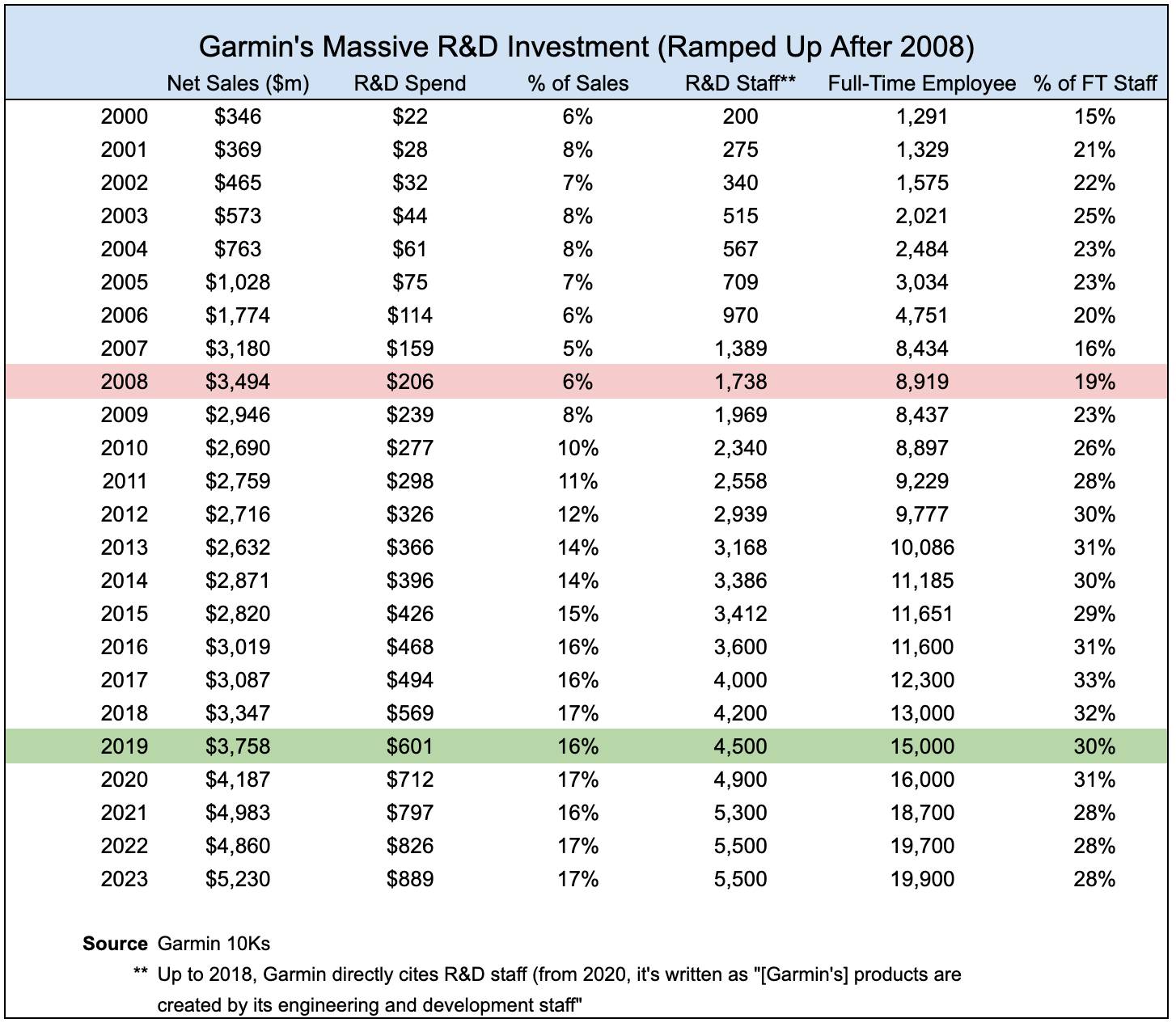 As you can see in the chart below, Garmin decided to spend big bucks on R&D initiatives and hire more R&D-related staff after their 2008 gut-punch. They ramped up spending despite the fact their sales and stock had taken a tumble, signaling a calculated risk and "betting on themselves" to bounce back.