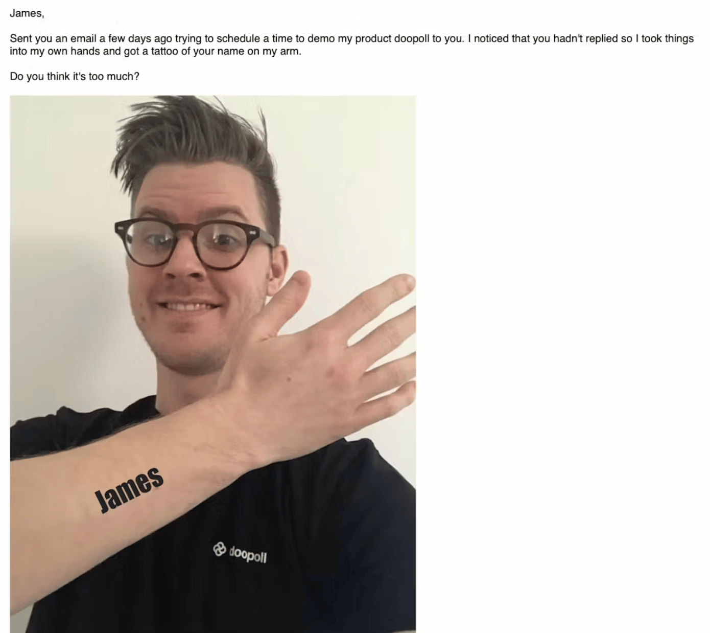 "I want to work with you so bad I got a {firstName} tattoo on my arm."