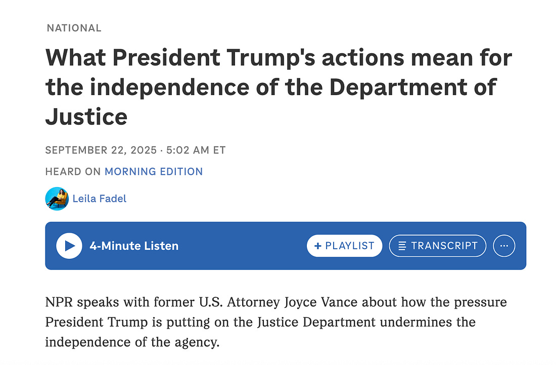 Trump is in full distraction mode. Remember the Epstein files? But there’s also a new crisis he needs to distract from, one that could easily fly under the radar screen. It’s the firing of the interim U.S. Attorney in the Eastern District of Virginia because he refused to indict a case that Trump wanted indicted against one of his political enemies. Trump is in the process of installing his new nominee, Lindsey Halligan, a real estate lawyer with no prosecutorial experience, but presumably plenty of loyalty to the president. Authoritarian leaders in other countries jail their opponents. They use politically motivated, trumped-up charges to jail their opponents, to suppress dissent among their people, and to consolidate their power. Journalists and pro-democracy advocates are frequent targets. This abuse of prosecution power is a hallmark of political repression. I spoke out on NPR yesterday. If you missed it, I hope you’ll listen now, or read the transcript. If Trump’s ability to control the Justice Department isn’t checked in this moment, we’ve hit a dangerous red line for democracy. We cannot afford to let this moment pass without raising our voices and continuing to do so. Other important developments are taking place, but we cannot let this one die with the news cycle. Too much is at stake. Who might Trump demand prosecution of if he gets away with this? It could be former FBI Director James Comey, who the New York Times reports is now under consideration by the office Halligan now heads. It could be senators, state attorneys general, or governors who confront Trump. It could be any of us, and that’s the point, that’s the essential danger of the moment. It could be any of us. We’re in this together, Joyce You're currently a free subscriber to Civil Discourse with Joyce Vance . For the full experience, upgrade your subscription. |