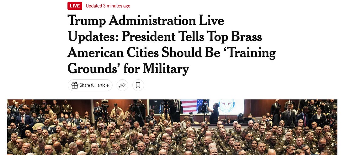 Whatever happens today in Virginia this story is a clear warning from our military leaders that they believe Trump is taking us in a dangerous direction, one that I recently described as “surrender, not war.” It is why standing with Ukraine and our European allies is one of the top 4 items on the Hopium agenda, and something Democrats should be fighting for in the fall budget debate. Note that the very next story in the Washington Post this morning is this one: And yes, as expected, Trump made the case to his generals to turn their attention from our adversaries abroad to the enemies within in his speech today, which we all have to believe is the reason this meeting took place (for they were getting resistance): Our military leadership are right to be alarmed about where all this is going, and it is why we must be doing everything we can to keep soldiers off our streets. More on this tomorrow…. The Chaos Monkeys In The White House Are Choosing To Turn Off All Government Economic Data If The Government Shuts Down - From The NYT (gift link):