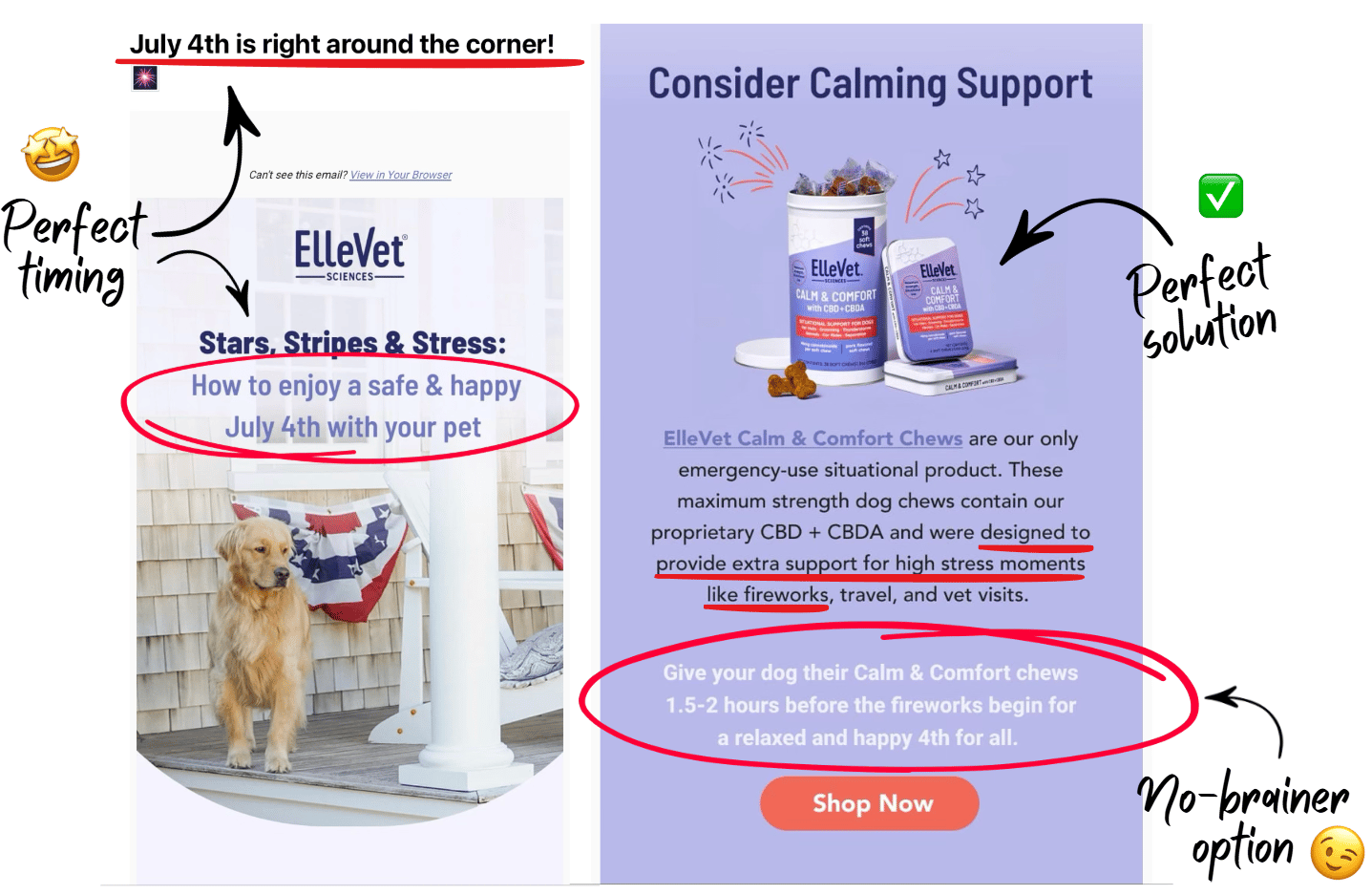 For many dog owners, New Year's Eve and July 4th spell disaster because fireworks send their fur babies into panic mode. So ElleVet Sciences slipped their Calm & Comfort Chews into customers' inboxes about three weeks before a loud event.
