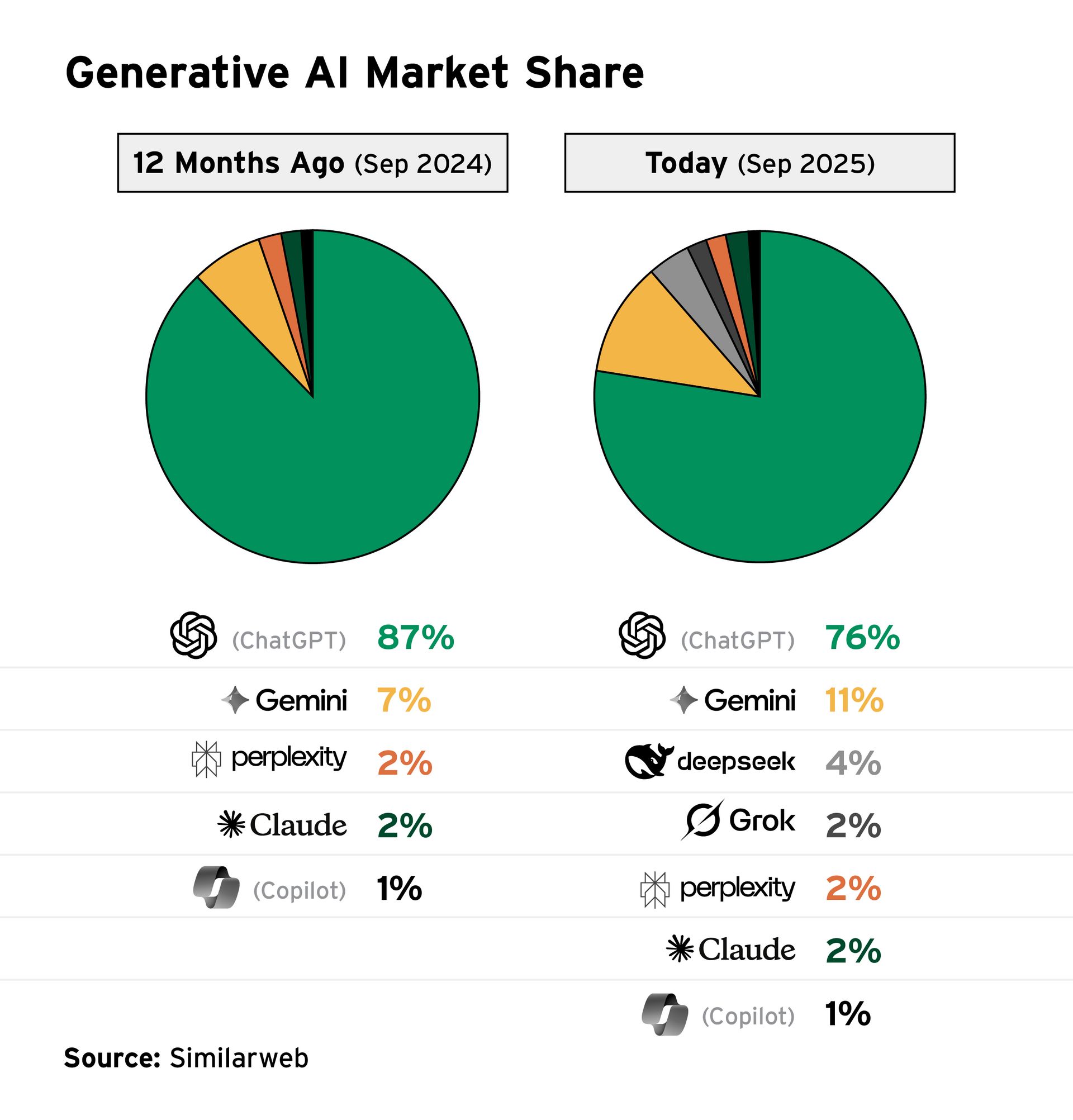 | How People Use ChatGPT vs. Claude vs. Gemini | New data from OpenAI and Anthropic is shedding light on how people around the world are actually using large language models (LLM), and the differences are striking. | Anthropic's Claude is primarily used for computer and mathematical tasks, such as coding support. In contrast, OpenAI's models are more frequently used for educational support and writing assistance. | ChatGPT's top use case is practical guidance — 28% of queries are about schoolwork, workouts, or everyday advice. Its role in the workplace has fallen: In 2022, 47% of prompts were work-related; today, just 27%. | Claude skews professional. Coding alone accounts for 36% of prompts (vs. 4% on ChatGPT), with another 7% in scientific tasks. In total, about 43% of Claude usage is work-related. That's by design: Anthropic trained Claude to be safe for work. | This split is reflected in their revenue mix. At OpenAI, about 75% of revenue comes from consumers (the $20/month Plus plan), while enterprise accounts (roughly $60 per seat, per month) make up the remaining quarter. For Anthropic, only ~15% of its revenue comes from consumers, while 85% comes from enterprises. | Meanwhile, Google's Gemini has steadily gained share. Its new image generator, Nano-Banana, briefly pushed it past ChatGPT to the top of the App Store. But its real advantage lies in distribution. Google is already integrated into the lives of 90% of global internet users. | AI is being woven into the tools billions already use: drafting emails in Gmail, managing files in Drive, analyzing data in Sheets. | | At the company level, Google is using AI to reinforce its core businesses: search and advertising. Users are already adapting — the number of Google queries with 8-plus words has jumped 7x in the past year, a sign that people are starting to treat search like an LLM. Despite this shift, Google still trades at a discount to other AI growth stocks. | Who called this months ago? Oh yeah, we did. | |
