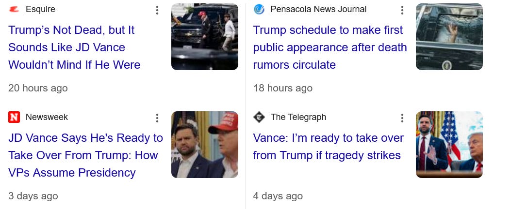 On Trump's Escalating Madness, Epstein, Compromise And The Unsustainable Path He Has ChosenHopium Paid Subscribers Gather Tonight At 7pm ETMorning all. Today’s post is a more of a collection of notes rather than a coherent essay as we all try to asses where we are now after Trump’s terrible August of spiraling madness and physical decline. So here we go….. I think Trump’s disappearance last week was a significant event, and suggests that he is having significant physical and/or cognitive challenges. As we’ve discussed Trump had not taken a vacation all summer - an odd thing for such an old man in such a demanding job - which I’ve felt was a sign of disquiet and worry in his mind, a desperate need to reverse his declining poll numbers and growing sense that his government is failing, to somehow make Epstein and his horrible past disappear, of the shock of two buddies, Elon and Putin, turning on him. Rather than being a slow month to rest and reset ( as JD Vance viewed it), Trump manically attacked August - the wild, impulsive and destructive tariffs; the red carpet for Putin; the occupation of DC; the firing of the heads of the BLS and DIA and a Fed governor; Kennedy’s medieval assault on our public health; the escalating campaign to steal Congressional seats and make our elections bend the knee to him; the venal harassment of Kilmar Abrego Garcia; a new effort to illegally and unconstitutionally wrest control of federal spending away from Congress; the dark middle of the night loading of young children to traffic them to Guatemala, Uganda or god knows where else….. Then he just disappeared without any explanation of where he had gone. No “vacation” - which would have been deserved and welcome - no a few days golfing. Just gone. Off camera for a week. After his manic and reckless August it was a bit of a shocker, and does suggest that his health problems - evident to the eye, unable to be AI-ed away - are far more serious than they admit. Then there was this bit of palace infrequent - Vance saying he was fired up and ready to go if anything happened to Trump…. Yesterday Trump showed up for the cameras again and it was ugly. His remarks were wild and deeply unhinged - mad even. Here’s NBC News reporting, straight up, on why Trump said he moved Space Command from Colorado: