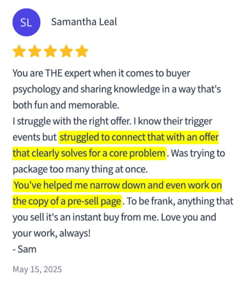 | Not interested in designing a scalable offer? Click here to mute Offer Breakthrough emails. (Don't worry—you'll still get our regular newsletter.) "I need to burn down my business and create a new offer from scratch to scale." Hold up. WHO told you that? …Probably all the "passive income" gurus, right? What they don't want you to know is that it's often easier to scale your existing services than to make meaningful money selling a digital product. I said what I said. Zaynab also realized that after going through my hands-on Offer Breakthrough workshop. And it's something I recently realized in my *own* biz. I wanted to build a high-ticket offer and thought my next big idea had to be something brand spankin' new—built from the ground up. The thing is, I loooooved UNIGNORABLE (the personal branding challenge I ran with the folks at Demand Curve). And participants loved it, too. But I hated our model. Doing big launches and running cohorts with 300+ participants drained me. But the deep 1:1 sessions with brilliant folks like Alex Smith and Sarah Hart lit me up. After a whole lotta soul searching (and going through my own Offer Breakthrough workshop a few times to get out of my head)... I realized I didn't need to burn down my whole business and start over. I just needed to repackage what I (and buyers) already loved into a more sustainable model. Here's what grinds my gears… Most "passive income" gurus swear you need to create courses or online communities to scale your service biz. But it's often easier to sell a $20,000 service to one person per month than to consistently find 400 people to sell a $200 course to. (Spoiler alert: Most people *don't* wanna DIY. They just want the outcome they'd get from learning the skill. If they can get outcomes without the effort, they'll happily pay more.) And thanks to AI, it's never been easier to scale a service. So contrary to what the gurus say… You *don't* need to reinvent yourself, build a course that causes more headaches than it's worth, or start a time-consuming membership. There are plenty of other ways to build a scalable biz that runs on your terms. But you do have to start by answering this important question: What are the painful problems buyers will *actually* pay premium prices to solve? That's what you'll uncover inside my upcoming Offer Breakthrough workshop. You'll learn to spot the difference between annoying problems they merely complain about and painful problems they'll happily open their wallets to fix. Then you'll reverse-engineer an offer around those expensive problems. Whether that's repackaging your current offer into a more scalable model or designing a new one… You'll walk away from Offer Breakthrough with a clear offer idea you're excited about—and are ready to test. Wanna design a scalable offer that *actually* sells? Doors close on Monday at 3 p.m. EST. Join Offer Breakthrough before time runs out > With ♥️, P.S. Can't attend the 2 live workshop sessions on September 30th and October 7th? No sweat. You get lifetime access to all workshop materials, including the new on-demand course version. Same system, just done on your schedule. So you'll have everything you need to succeed whenever you want. P.P.S. Wondering how you can actually scale services without working yourself to death? AI, baby. The smartest service providers are already using AI to: - Cut delivery time by 70%+ without sacrificing quality