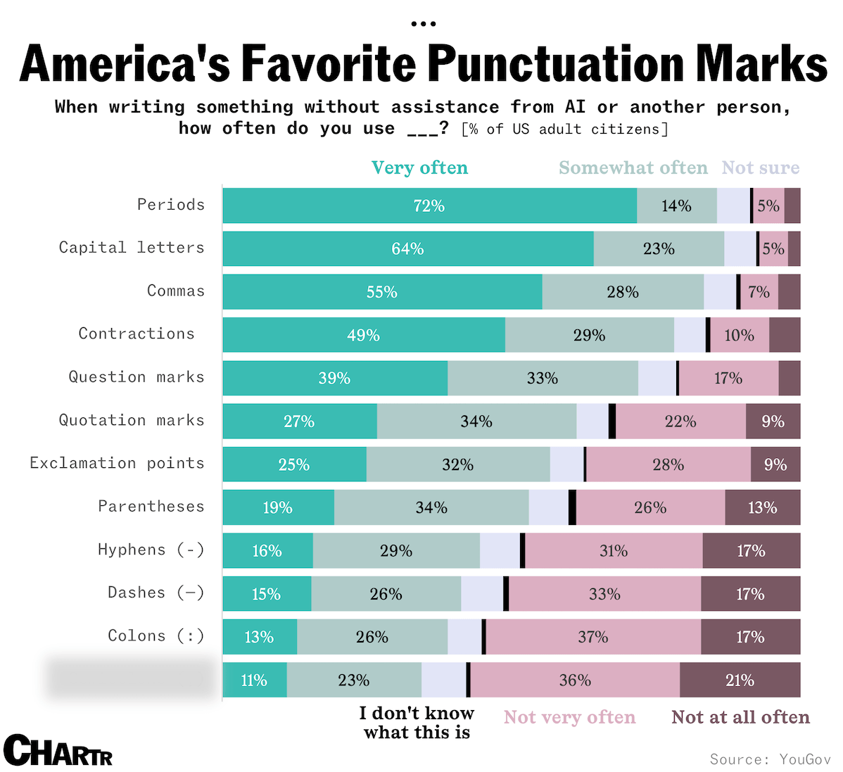 Off the charts: Which piece of punctuation, often employed in complicated lists or to combine separate clauses, is the least used, per a recent YouGov survey? [Answer below]. |