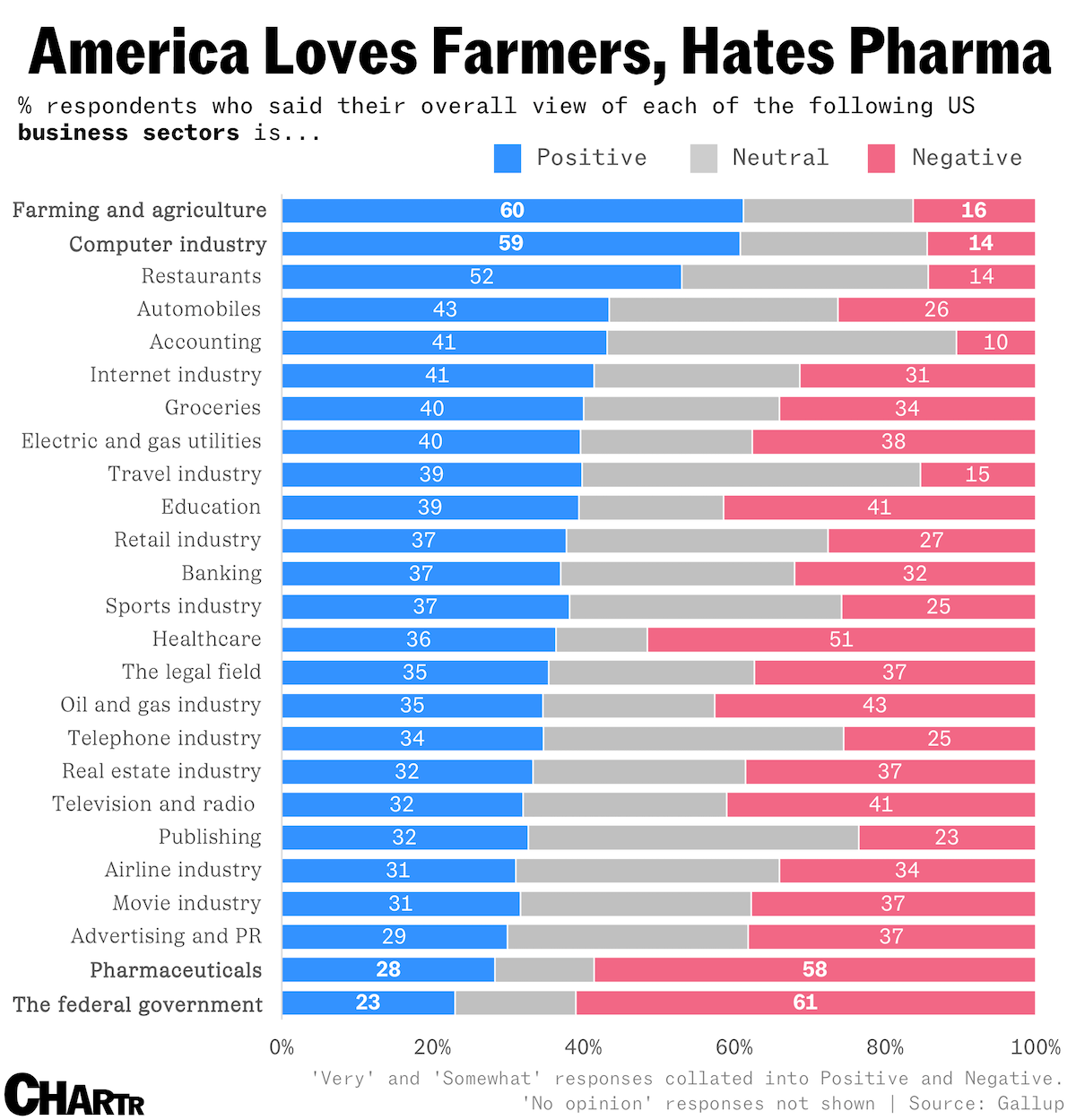 This places the government below the pharmaceutical industry, which has been at the lowest position in the ranking for the last two years. In a year that's seen sky-high tariffs for pharmaceutical product imports, the sector's share of positive ratings has increased by 8% from 2024, while the government's has sunk by 3%. Still, along with healthcare, both sectors scored very few neutral responses. |