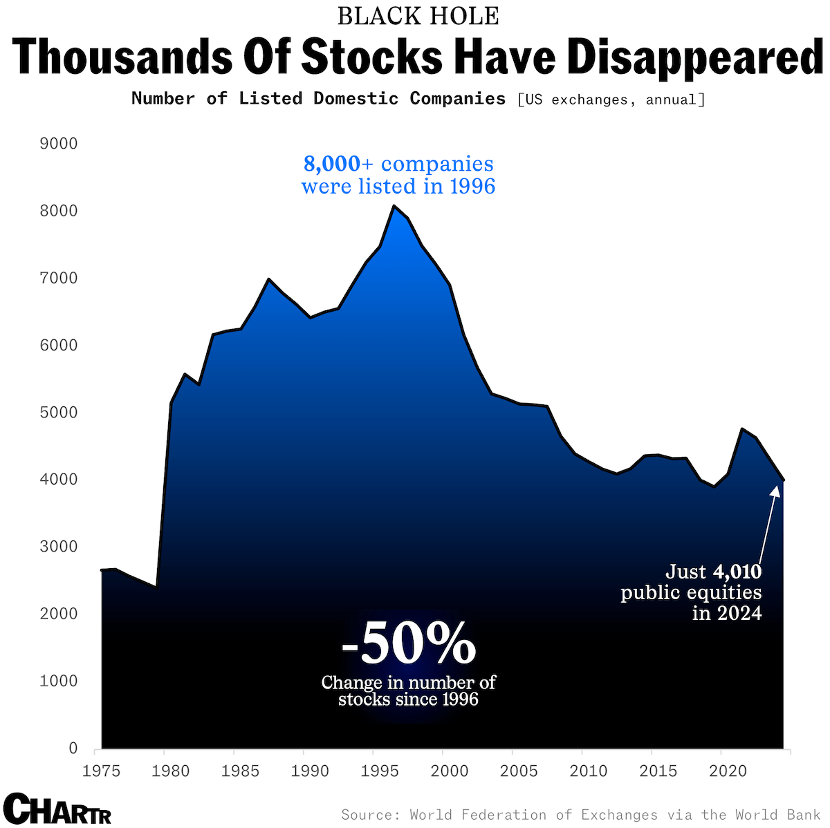 Aided by a private markets capital pool that increasingly rivals its public cousin, the swelling dealmaking economy is contributing to a broader trend: the slow decline of public markets. Indeed, many high-profile startups like SpaceX and OpenAI have completely bypassed the hassle of public markets (like quarterly reporting *cough*), finding no problem raising tens of billions of dollars for their cash-hungry operations. |