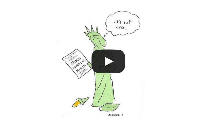 Tonight is a picture night, but one a little bit different than usual. Cartoonist and writer Liza Donnelly and I have been experimenting with different ways to integrate art, politics, and history, and since tomorrow is the anniversary of President Gerald Ford’s pardon of President Richard Nixon, we took that event out for a spin. You can find Liza at her Substack Seeing Things. It’s an illustrated review of the day’s news including people or scenes Liza sees in her travels. I’ll be back on my regular beat tomorrow. And if you have ideas for historical events you’d like to see us cover this way, please drop them below. You’re currently a free subscriber to Letters from an American. If you need help receiving Letters, changing your email address, or unsubscribing, please visit our Support FAQ. You can also submit a help request directly. For the full experience, upgrade your subscription. |