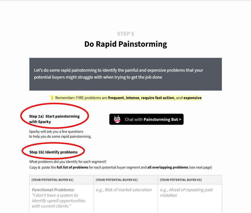 But instead of telling you, let me show you what I mean. Here's a sneak peek inside your Offer Breakthrough workbook: One of the most important steps you'll complete in this hands-on workshop is what I call "Painstorming." All problems are *not* created equal. Some problems are merely annoying, like a mosquito buzzing around your head. No one's gonna pay $3,500+ to fix that. They'll either squash it themselves or wait for it to fly away. But certain problems are what I call "FIRE" problems. They're Frequent, Intense, Fast action, and Expensive. And *they're* the painful problems buyers will pay to solve. Your workbook walks you through the exact process to uncover these problems, with loads of examples to guide your thinking. Here's a peek inside: