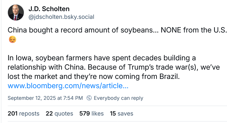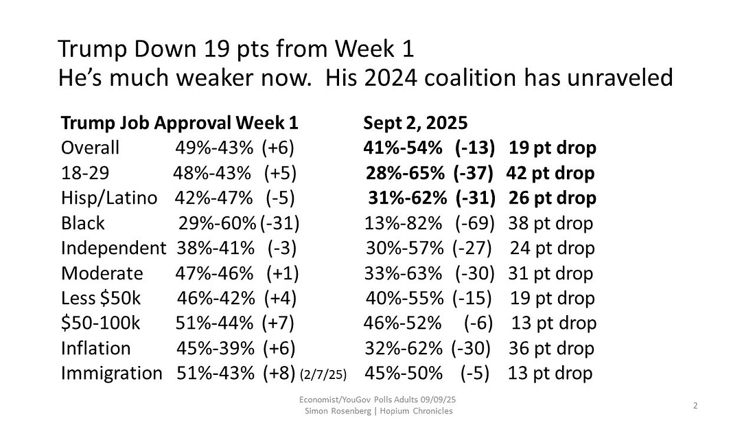 Sunday Hopium - Trump Is Unpopular, Weakened, And Losing All The Arguments That MatterStand Up For Science rally in DC Wed, VA early vote begins FridayMorning everyone. Sundays are rest and recharge days here at Hopium but got a few things for you….. Head to yesterday’s main Hopium post for my commentary (posts and videos) on the killing of Charlie Kirk and it’s aftermath, and links to new interviews with a great collection of Senators, Reps and Mikie Sherrill. We all need to be paying more attention to what is happening with farmers and the farm economy. The tariffs have hit farm country very, very hard….. We must press hard this week to get a real explanation for what is happening to a clearly ailing Trump’s health. He “shakes too many hands” doesn’t explain this: Yes, on Friday a Fox News host called for all homeless people to be killed. Latest public display of MAGA’s escalating embrace of eugenics. And no, this ain’t more “locker room” talk….. In related news the NYT has a must-read magazine piece on Trump and Kennedy’s dismantling of our cancer research ecosystem in the US. For yes, they want more of us to die: