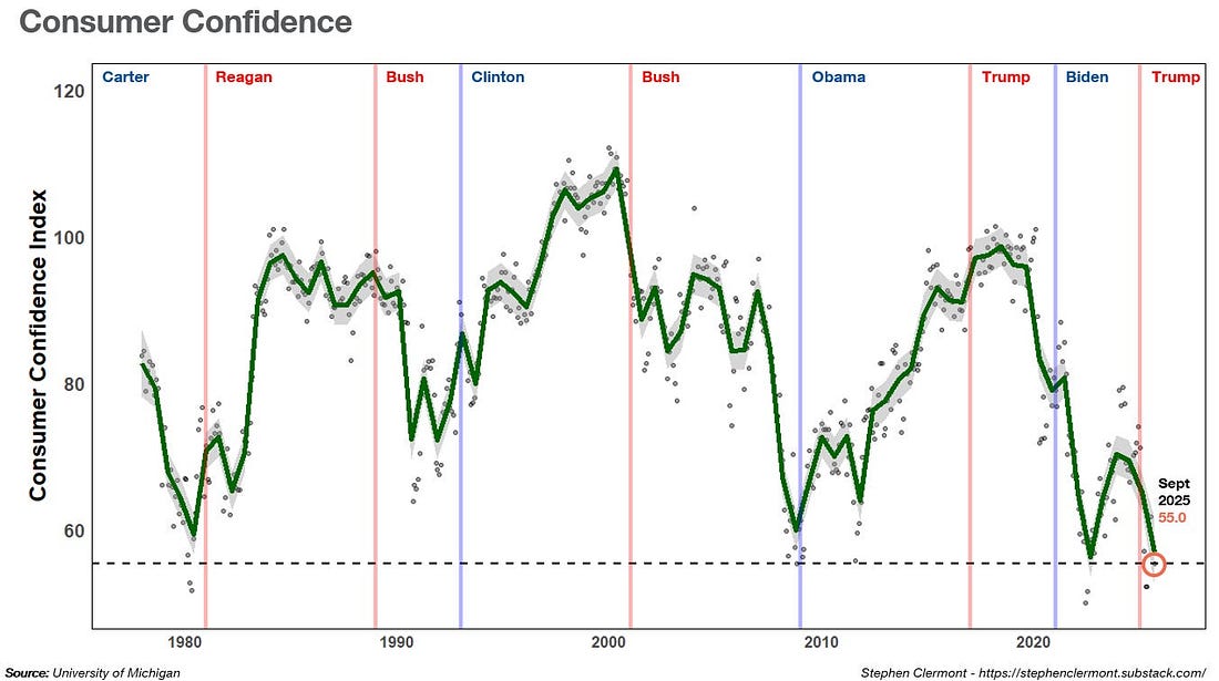 As I mentioned on Thursday this week we even saw credible, independent polls with Trump is negative territory on crime and border security. Here’s our weekly look at the unraveling of Trump’s 2024 coalition: Reupping the graph from our Stephen Clermont that tracks the U of Michigan Consumer Sentiment survey over time. Their Friday report found a big drop in consumer sentiment these past few weeks, consistent with the bad inflation and jobs data we’ve been seeing. In this survey consumer sentiment is now lower than any point in the last 50 years: Trump is weak, not strong. A failure, not a success. A loser, not a winner. An old ailing man, not a virile one. A villain, not a hero. And a clear sign of his weakness and decline is his inability, despite their extraordinary information superiority, to bring the country along with him on the things that matter most. It’s a sign of how his powers are ebbing, why he has been so manic and desperate of late - for the country is growing more distant from him - and why we have to keep working as hard as we can. For those in DC there is a Stand Up For Science rally on Wednesday at 8am downtown. Register here and invite your friends! For those in Virginia early in person voting begins this Friday, and I am encouraging everyone reading this to vote as early as you can. When you vote early your name comes of the GOTV rolls for the Virginia campaigns. This allows them to move on faster to lower propensity voters, which then drives up overall Dem turnout. Voting early - Fri, Sat, Sun - helps create a sense of “hey, everyone is voting” which encourages others to vote early and helps us create what we’ve called here “a virtuous cycle of participation” which increases our turnout and makes it more likely we win. Voting early increases Dem turnout and makes it more likely we win - so vote early good people of Virginia! Now, Let’s Get To Work Everyone!Support Our November, 2025 Candidates