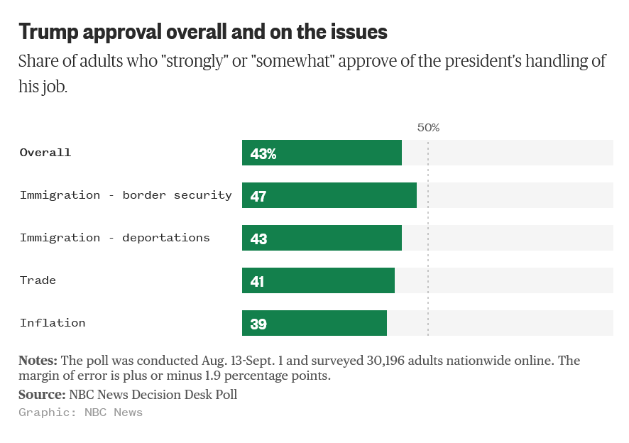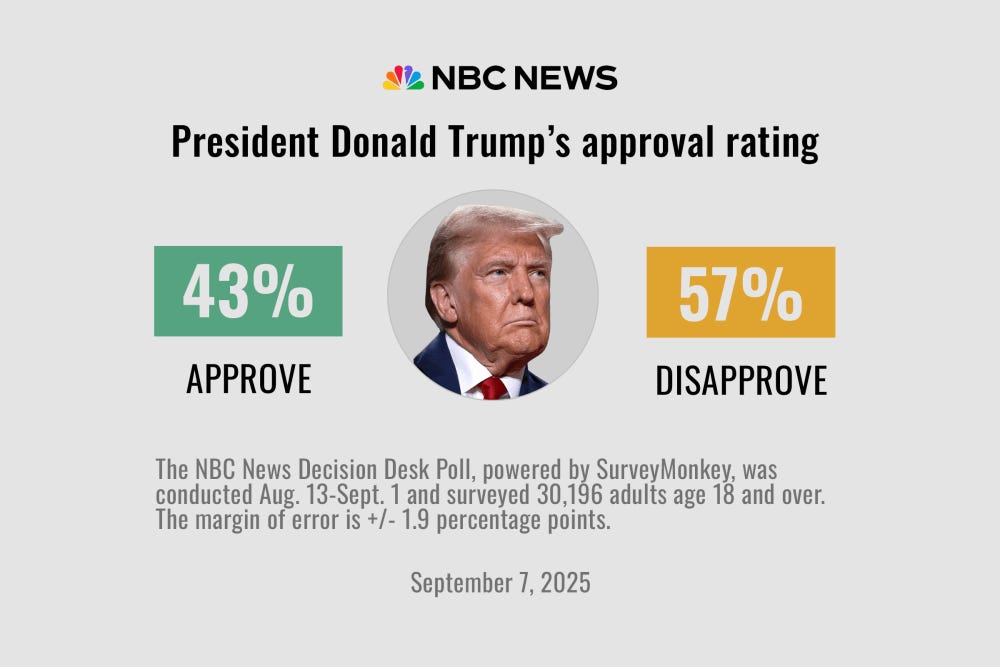 Watch my new interviews with Senator Angela Alsobrooks and Rep. Dan Goldman to get fresh views on our current moment from inside the Senate and House. A new NBC News poll released this morning is one of the worst polls Trump has seen this cycle: He is now underwater on every major issue, including border security: And this poll at least suggests that Americans do care about more than just “kitchen table” issues. Friends, we should the fall as a time of opportunity for us. Let us seize it, together. Winning The Fall In New Jersey By Electing Mikie Sherrill - One of the most important ways we can win the fall is to keep the momentum from our wins and overperformances in elections across the US this year going and ensure our November candidates rack up decisive victories. I am excited to share a new interview with one of those candidates, Rep. Mikie Sherrill, who is leading in her battle to become the next governor of New Jersey. Sherrill joined us earlier this summer for what was a warm and wonderful discussion of her race, even embracing our label of a proud, plucky patriot! The events of recent weeks have shown us the importance of strong governors in this extraordinary battle against Trump. Here, in New Jersey, we have an opportunity to not just elect a new governor but someone who has the potential to be a very strong and consequential one. In our discussion (video and transcript above) Sherrill updates us on where things stand and the arguments she is making in these closing weeks of the campaign. What you will see and hear is a strong candidate, confident of her message and plan, working as hard as she can to lead her state in a time of enormous challenge. As she likes to say in the Navy she was trained to run into battle not run from it and it is very clear she is running into this fight with everything she’s got. Recent polls show Sherrill with sturdy 7 and 9 point leads with likely voters, and far better favorability than her MAGA opponent. If we work hard here and close strong we should be able to win this race this November. You can donate, volunteer and learn more about Rep. Sherrill through our links below. Please do what you can to help her win - simply, this is a must win race for us, and everyone should be “all in” on this one. To me the most compelling part of our conversation was her reflections on the strength of her campaign’s message, and the weakness and distance of her opponent’s. By focusing on improving people’s lives and addressing rising costs Sherrill tells us that she is where voters are now, and that her argument and agenda are being very well received on the ground, with voters. Her opponent, however, by backing Trump’s agenda that is raising costs through tariffs and raising energy and health care costs through the big, ugly bill is struggling to connect to voters who want something far better than what MAGA is offering them now. Her report is confirmation of the opportunity we have this fall (and next year too) as voters come to understand that Trump really has pursued an agenda of sabotage, plunder and betrayal and is for the oligarchs, not the people. While 2024 was a very tough issue environment, our candidates are facing a far more favorable one now. This week Sherrill opened up a new front in her campaign, one focused on rising utility costs in the state. Here is her new ad, “Bold Leadership” - Note how hard the campaign leans into something we’ve discussed here at length - the need for our candidates to not just get the issues right but to also be strong leaders, strong and resolute enough to actually get things done for voters. A reminder of Exit Poll data that tells us we must take “strong leadership” and “can bring needed change” far more seriously in our understanding of how people forge their opinions about leaders and parties: We must not only have an agenda that will make things better for the American people we must also be strong and resolute enough to be able to enact it on their behalf. And, now that Trump is underwater on every major issue - even border security in the new NBC News poll - we have to work take this last essential building block of his brand - strong leader who can bring needed change - away from him and work together to make him weak, not strong; failing, not succeeding; a loser not a winner; and a villain not a hero. That too is another way we can win the fall. Now, Let’s Get To Work Everyone!!!!!!!!!!!!!!Support Our November, 2025 Candidates