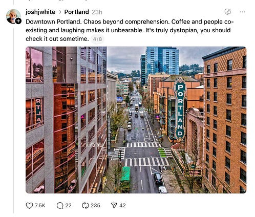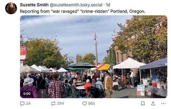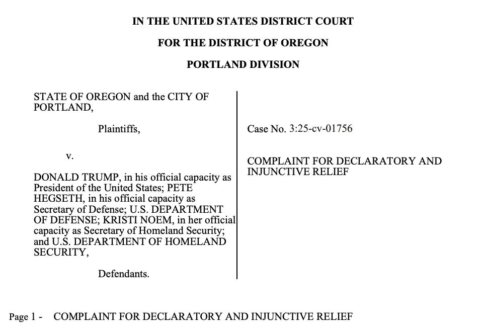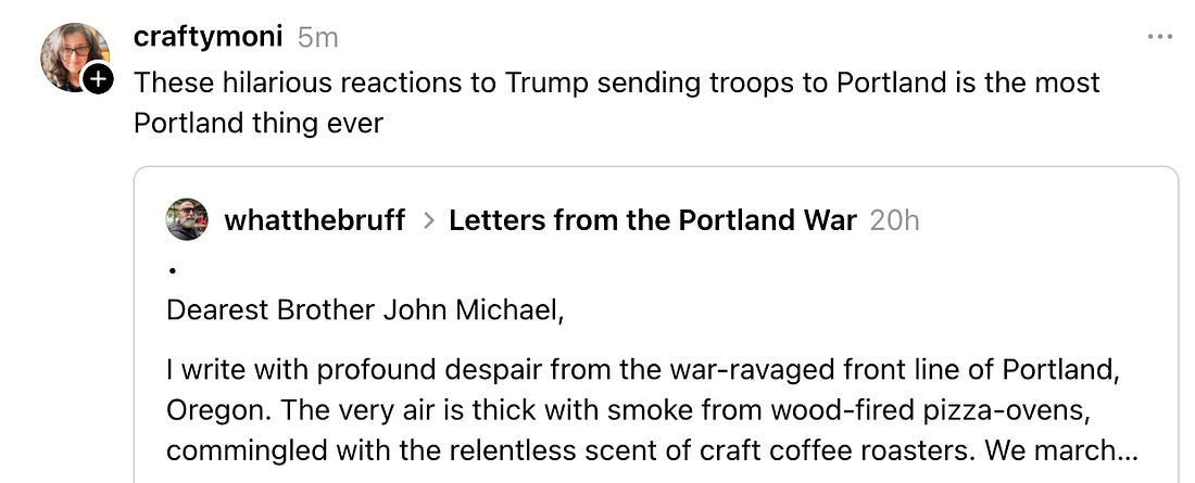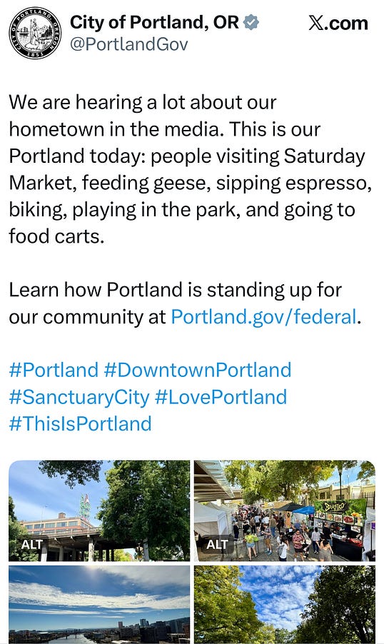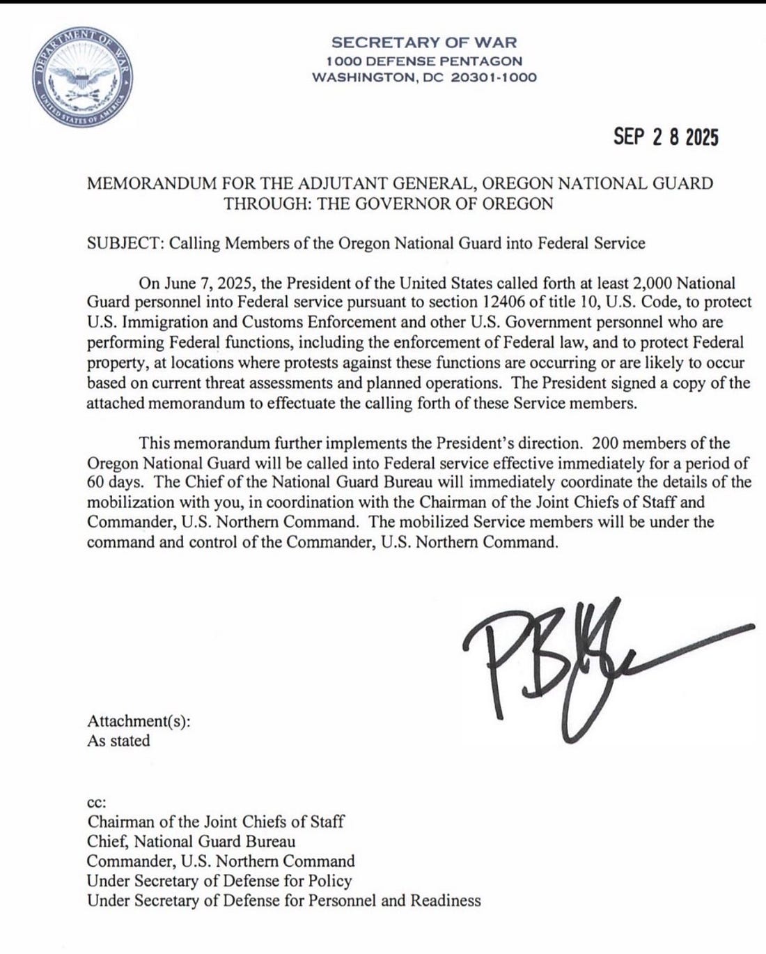 On Saturday, the “Department of War” asked Oregon for the use of up to 200 National Guard troops. The troops, which would be federally funded but remain under state control, are to help with immediate needs to protect “federal personnel, functions, and property” in the state. The “request,” included the claim that “failure to mobilize sufficient forces quickly to address the situation may risk lives and property damage.” There was a threat attached: If Oregon failed to go along—within 12 hours—the Secretary of War would federalize as many troops as he deemed necessary. The “request” was made to the Adjutant General of the Oregon National Guard (ORNG), not to the governor. Trump posted on Truth Social that same day that the troops would “protect War ravaged Portland” and protect Immigration and Customs Enforcement facilities that he claimed were “under siege from attack by Antifa and other domestic terrorists.” He added that he was “authorizing Full Force, if necessary.” He didn’t specify what “full force” meant, but it was widely perceived as authorizing the use of lethal force against American citizens. Oregon, apparently, did not bend the knee. The Trump administration responded on Sunday. Trump used Title 10 USC §12406 to federalize 2,000 troops. If that sounds familiar, it should. It’s similar to what happened in neighboring California. Liza Goitein, the senior director of the Brennan Center’s Liberty and National Security Program, explained Trump’s application of this law back in June when Trump federalized California Guard troops, explaining the law “allows the president to call up the National Guard if there is ‘a rebellion or danger of a rebellion against the authority of the Government of the United States’ or if ‘the President is unable with the regular forces to execute the laws of the United States.’” This is not The Insurrection Act, but past presidents have used this provision alongside The Act as authority to call-up troops pursuant to it. Trump takes the view that he has inherent authority to deploy troops to protect federal prerogatives, using § 12406 to make it happen. The thin hook he relies on is a claim that he believes a situation exists where he is “unable with the regular forces to execute the laws of the United States” and that once he makes that assessment, no one, including the courts, has the authority to countermand it. Despite Trump’s claims about the city, Oregon Governor Tina Kotek said, “There is no national security threat in Portland. Our communities are safe and calm.” Residents posted pictures of their weekend activities. Like this: And this: Letters from the front are flooding social media. And this. This is Portland, people. The ridiculousness of Trump’s claims doesn’t make the situation any less serious. California and Illinois having held the line until now, Trump seems determined to try again in Oregon to claim for himself the unprecedented ability to put troops on American streets and to use them against American citizens. (There may be something reemerging with Chicago, where large numbers of federal agents have been seen patrolling the streets today.) Goitein told me that “presidents have deployed troops domestically to quell civil unrest or enforce the law only 30 times in our nation’s 250-year history, yet if Trump follows through in Portland, he will have done it three times in nine months. This is wildly out of step with our nation’s principles and traditions.” Trump is undoubtedly hoping for a confrontation in the city that he can use to justify his claims. Sunday afternoon, the state of Oregon sued the Trump administration. “The ‘traditional and strong resistance of Americans to any military intrusion into civilian affairs’ has ‘deep roots in our history,’” Oregon’s complaint begins. “Our nation’s founders recognized that military rule—particularly by a remote authority indifferent to local needs—was incompatible with liberty and democracy. Foundational principles of American law therefore limit the President’s authority to involve the military in domestic affairs.” That power is primarily reserved to Congress. Oregon agrees that Congress has delegated a portion of that power to the president, but notes that “it carefully limited the President’s authority to exert control over a state’s National Guard—the modern term for the militia—to specific circumstances. And for over a century and a half, Congress has expressly forbidden federal military interference in civilian law enforcement.” Oregon has asked the courts to both preliminarily and permanently enjoin the administration’s actions. Trump wants the confrontation because he wants the power. And he’s acting like a man who believes the Supreme Court will give it to him, or at least act slowly enough to let him claim it. Last week Donald Trump: