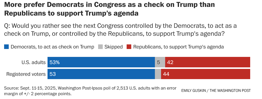 It is a pattern that just repeats again and again - he escalates, the public rejects it, and he grows more unpopular and distant from all of us. Here’s our weekly breakout of the Economist/YouGov data. It’s staggering levels of decline and erosion: G. Elliott Morris has written about the unprecedented intensity of the opposition Trump now faces, intensity that is showing up in our repeated overperformance in special and local elections this year and in our sturdy leads in the NJ and VA gubernatorial races. These new polls also show how incredibly unhappy the country is not just with him but with his agenda, even in areas that the chatter tells us are areas of strength for him. Here’s AP-NORC with crime at (-7) and immigration at (-13): The new Washington Post-Ipsos poll has similar data - crime -10, immigration -11: Here’s G. Elliott Morris’s latest issue tracker (and note throughout all polls the issue with the greatest intensity and where Trump performs the worst is inflation/prices/trade/tariffs): What this shows is that despite their enormous information superiority Trump is not winning any sustained argument with public with perhaps the exception of “border security,” and even there he is not consistently above water in recent polling. Three more bits of data that suggest Democrats are right to believe they can win a sustained argument with Trump on the budget this fall and winter. From Navigator Research: From Washington Post-Ipsos: Also from WaPo-Ipsos: As we discussed yesterday we’ve seen far more ambition from Congressional Democrats this week then we’ve seen all year, and given the extraordinary budget debate to come, it is the right time for us to be finding a higher gear. While I am optimistic about winning this debate in the coming months with a weakened, failing and unpopular leader, it is my belief we will need to make this debate about more than health care (as important as that is), and create a far more comprehensive and politically potent narrative about why he is failing the country, the American people and our democracy. For more on making our narrative bigger head here, here, and here, and expect more on that from me in the coming days. Rest up and get ready peeps. The big debate over the budget has begun and it is one we simply must win. Enjoy My Interview With Eric Croft, The Chairman Of The Alaska Democratic Party - Today I am excited to share the fourth interview in our series with the state party chairs of our new audacious expansion states, this one with Eric Croft, the new Chairman of the Alaska Democratic Party. A recording and transcript are above. In a lively and informative discussion Chair Croft gives us a terrific overview of the current political landscape in Alaska. It is a state where far right politics has been repeatedly challenged by a coalition of Democrats, independents and moderate Republicans, leaving the incumbent MAGA Senator, Dan Sullivan, out of step with Alaska voters and recent trends. Chair Croft expresses confidence that if the most popular Democrat in the state, former Rep. Mary Peltola, gets into the Senate race we will have a shot at making it competitive next year. As we discuss the investment we are making in the Alaska Democratic Party now, early, will make it far more likely that we can make this race competitive and give us a chance of flipping the Senate next year. The Chair talks very directly about why our investment in Alaska matters and the impact it will have in strengthening their operations next year. A reminder that one of our Senate SuperPACs went up with this hard-hitting tariff ad in Alaska this week, a sign that the national investment required to make this race competitive has begun: Get to this interview with Chair Croft when you can. It’s a great on-the-ground report on the current state of our politics in a place that may become one of the central battlegrounds in 2026. And thanks to everyone who has contributed so far to our Audacious Expansion Fund. We’ve raised over $22,000 so far. Amazing! Now…… Let’s Get To Work Everyone!!!!!!!!!!!!!!!!!!!!!!!!!!!!!Support Our November, 2025 Candidates and Yes On 50