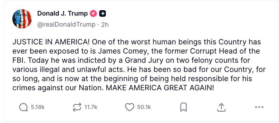 Only one prosecutor signed the indictment, which is unusual. Trump’s newly appointed U.S. Attorney and former criminal defense lawyer, Lindsey Halligan, signed. Typically, the signature of the U.S. Attorney is accompanied by those of the prosecutor or prosecutors who worked on the investigation and will be handling the guilty plea or trial that comes next. It’s not entirely clear what statements by Comey the indictment refers to. It’s believed to be about Comey’s sparring match during that Senate hearing with Ted Cruz. But the indictment doesn’t make that entirely clear. We have a system of “notice pleading” in our criminal justice system, which means a defendant is entitled to notice of the charges against them so they can prepare a defense. It’s likely Comey’s lawyers will ask for a bill of particulars, which will force the government to specify the precise statements he is charged with making and the factual basis for the charges. The defense will receive further information about the government’s evidence during the discovery process. Comey made a statement tonight, which you can listen to here. He says he’s ready to go to trial and that he hopes Americans will do their duty and vote. When Comey says “Let’s have a trial,” presumably, that doesn’t mean waiving potential defenses, like the selective and vindictive prosecution motions we’ve been discussing. His lawyers are too seasoned to do that lightly. In the federal system, motions that aren’t made in a timely fashion are deemed waived, and in a criminal case, you play all of your cards. The Judge in the case, Michael Nachmanoff, scheduled arraignment for October 9. The schedule for the case moving forward, including items like discovery and pretrial motions as well as a trial date, will be set then. The Eastern District of Virginia is notorious for its “rocket docket,” with judges committed to moving cases quickly. This case will not linger, as the prosecutions of Donald Trump did. Judge Nachmanoff was a federal magistrate judge for six years before President Biden appointed him to the district court. Prior to that, he served as a federal defender for 13 years and was the top federal defender in the Eastern District of Virginia for eight of those years. Trump, of course, commented. It’s a very disturbing moment in our country’s history. A president demanded an indictment of one of his enemies, someone he repeatedly ridiculed and vilified in public statements and social media posts, and he got it. He got it even though career prosecutors who had worked on the case didn’t believe the evidence met the standard for obtaining an indictment. In some ways, important ones, today’s news is about Jim Comey. But really, it’s about Donald Trump. It’s about a president who wants to abuse the power of government and make himself unstoppable. Don’t forget: We’re the guardrails. We cannot let that happen. We’re in this together, Joyce You're currently a free subscriber to Civil Discourse with Joyce Vance . For the full experience, upgrade your subscription. |