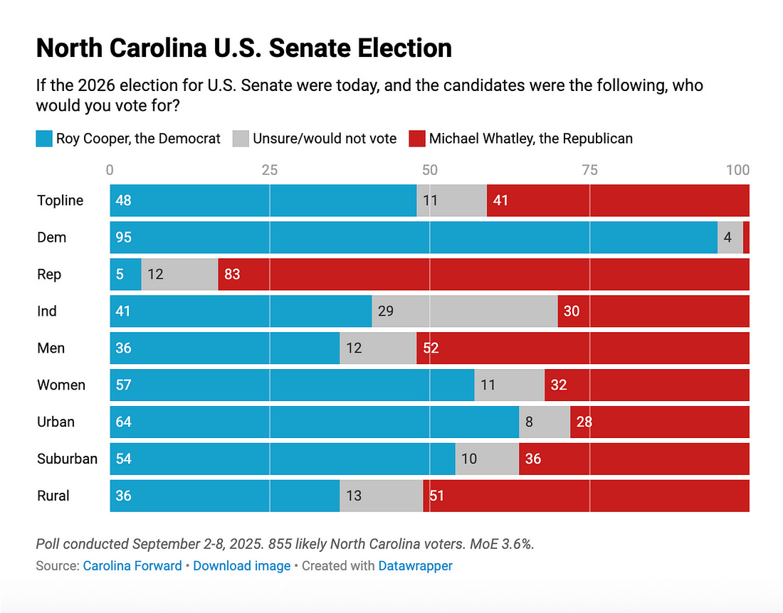 The pain of the Trump agenda is hitting red states and red places hard. The ACA and Medicaid cuts are making health care more expensive and harder to access. Cuts to clean energy investments are increasing electricity and energy costs. The tariffs are cutting off foreign markets, turning foreign countries and consumers against America and raising prices on everything. Interest rates will are almost certainly going to remain too high due to rising inflation and our deteriorating fiscal condition. Mass deportation in a time of full employment has created severe worker shortages throughout rural areas of the country. The end to clean energy subsidies, general economic chaos, and an out of control DHS/ICE will slow investments into red states and red places, lessening opportunities for workers and young people there. And of course much of this is being done so Trump and his fellow New York and California donors can pay less in taxes…… Trump’s battering of the farm economy is giving Democrats an opportunity now to speak to and connect to communities that have been largely out of reach for us. As we’ve discussed if we are to expand and win back our majorities in the House and Senate we must learn how to win in red states and red places. It’s another reason why Dems should be coming out hard against Trump’s reckless and illegal tariffs and his destructive and maniacal drive to remove tens of millions of people from the US. We need to be on the side of farmers as Trump lays siege to the farm economy across the US. But there is something deeper happening here, something we saw last week in the tragic killing of Charlie Kirk - the chaos and damage Trump and his extremist politics has brought is not only hitting blue states and Democrats. Red places and Republicans are being harmed too. The young white man who shot Charlie Kirk came from a conservative, MAGA family. The young man who shot at Trump last year expressed right-wing views on social media. It’s been remarkable to hear the governor of Utah these last few days rail against the dangers of the unregulated social media and the unchallenged presence of Russian and Chinese accounts in our domestic discourse as Trump tries to wrest TikTok from the Chinese. In these these stories about struggling farmers there is a persistent expression of shock, abandonment, and betrayal, a repeated expression that we voted for him and now he has turned on us, that this isn’t what we thought we had voted for. As I wrote yesterday this loss of faith in him and his agenda, even among his voters, has been showing up in public polling for many months now, and that a reckoning for the damage and the chaos he’s brought has begun across the country. It is showing up in our consistent overperformance in local and special elections this year, in our sturdy leads in New Jersey and Virginia, and in this new encouraging poll from North Carolina: All of this is giving Democrats and our allies in the broader pro-democracy movement an extraordinary chance to lead, to offer a better path, to stand up for Americans across the country who are being so badly led and who want normalcy not chaos. The White House appears to be headed in a different direction, and rather than leading, and finding a better path, they are contemplating a full on assault against their political opposition. They have come to see the killing of Charlie Kirk as a way to blame us for the troubles in America that have almost been entirely caused by them, and this terrible, terrible regime is making far worse. It feels desperate and unhinged because it is, like so much of what he is doing now - the manic attempt to take over the Fed, the escalation in Venezuela, the invasion of Democratic cities, the siding with Putin in the war against Ukraine and Europe. His ongoing failures, his declining health, his extraordinary unpopularity, the danger of the Trump-Epstein affair are all driving him to even more dangerous spectaculars which in turn push him further and further away from an electorate looking for lower prices, greater opportunity, access to affordable, quality health care and far, far less chaos and danger. Where all goes is hard to know but I believe the failure of Trump to deliver what he promised has given us a big political opening, even in red states and red places, and we need to seize it, together. Hopium in DC and St Paul On Wednesday - Friends, I will be speaking at two events on Wednesday: The Stand Up For Science Rally in DC, 8am. Register here, invite your friends and join us! And then I head to St. Paul, Minnesota for an event with the Democratic Party. I wanted to go to Minnesota as a way of expressing my solidarity with proud patriots whose leaders were recently hunted down and assassinated by a right wing extremist. If you live in Minnesota, please join us on Wednesday and consider supporting this event even if you can’t make it in person. Now, Let’s Get To Work Everyone!Support Our November, 2025 Candidates