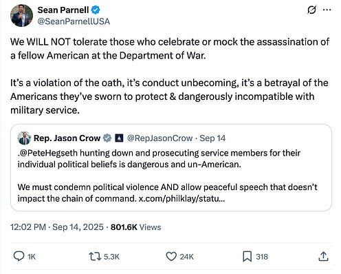 Think about that: the Secretary of Defense is asking the public to report U.S. troops for exercising the same freedom of speech we ask them to defend with their lives. Pentagon spokesperson Sean Parnell responded to criticism of this policy with an unhinged post on X, suggesting that expressing an opinion is a “violation of the oath.” What the hell is he talking about? Sean Parnell, the Pentagon spokesperson, responded to criticism of this policy with this unhinged post on X Expressing an opinion, no matter how odious, is a violation of the oath? What the hell is he talking about? Look, celebrating anyone’s death is gross, but it’s really not “dangerously incompatible with military service.” And it won’t stop with speech. When Vance hosted Kirk’s podcast yesterday, Stephen Miller echoed Trump’s promise to crack down on “far left” political organizations — despite zero evidence that Kirk’s assassination was anything other than the act of a lone individual: