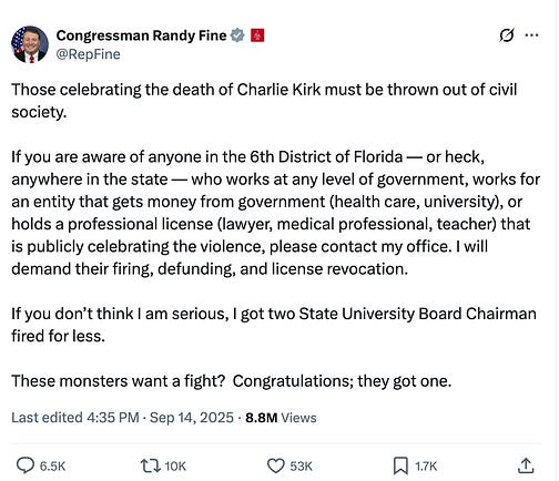 The Right Wing is winning the information wars. Trump, Fox News, and the rest are setting the terms of the political debate and drowning out the Democratic message. Message Box exists to help progressives fight back—with clear messaging, sharp analysis, and the tools to take on Trump, Fox News, and the rest. If you value this work, please consider becoming a paid subscriber for just $7 a month. Sign up for a 30-day trial right now. The assassination of Charlie Kirk is a tragedy. It’s a tragedy despite his odious, views toward so many Americans. It’s a tragedy despite the role he played in fomenting a toxic political environment where too many see violence as a viable solution. It’s a tragedy because he left behind a wife and two young kids. And it’s a tragedy because of how Donald Trump and his allies are weaponizing his death. The fact that Kirk was so well known — particularly among younger Americans who get their news from social media — and that his killing was captured in a horrifying video that spread rapidly online has made his death a national event. Trump and the right are going out of their way to turn Charlie Kirk into a martyr for the MAGA movement. Trump ordered flags to be flown at half-staff — an unprecedented move for a civilian outside elected office. Kirk’s casket was flown home to Arizona on Air Force Two. The Vice President canceled an appearance at a 9/11 memorial ceremony to meet with Kirk’s family in Utah. Trump will attend Kirk’s funeral. The Vice President even hosted Kirk’s podcast yesterday. Nearly every NFL game this past weekend held a moment of silence for Kirk. In all of these moments, Kirk is being lionized by his supporters and much of the traditional media as a “champion of free speech.” I disagree. In my view, Kirk was a champion of a certain kind of speech. But even if you accept the Right’s characterization, they are now doing the exact opposite of what they claim Kirk stood for. The primary response from the Trump Administration and the MAGA movement has been to use Kirk’s death to justify a massive crackdown on free speech. This is dangerously ironic on multiple levels. What the Right is pushing goes far beyond the “cancel culture” they once decried and borders on modern-day MAGA McCarthyism. A Government CrackdownWithin hours of Kirk’s assassination, the MAGA Right began claiming that “the Left” was celebrating his death. Their evidence? A handful of random Bluesky posts from people with no role in the Democratic Party or progressive infrastructure. To my knowledge, every elected Democrat and progressive leader who has spoken publicly about Kirk has condemned his killing and called for an end to political violence. The calls for censorship and punishment aren’t coming from random posters online; they are coming from the top ranks of the Republican Party. Congressman Randy Fine declared: Elon Musk amplified Fine’s post, saying, “100%.” At the Pentagon, Pete Hegseth took things even further. According to NBC News: