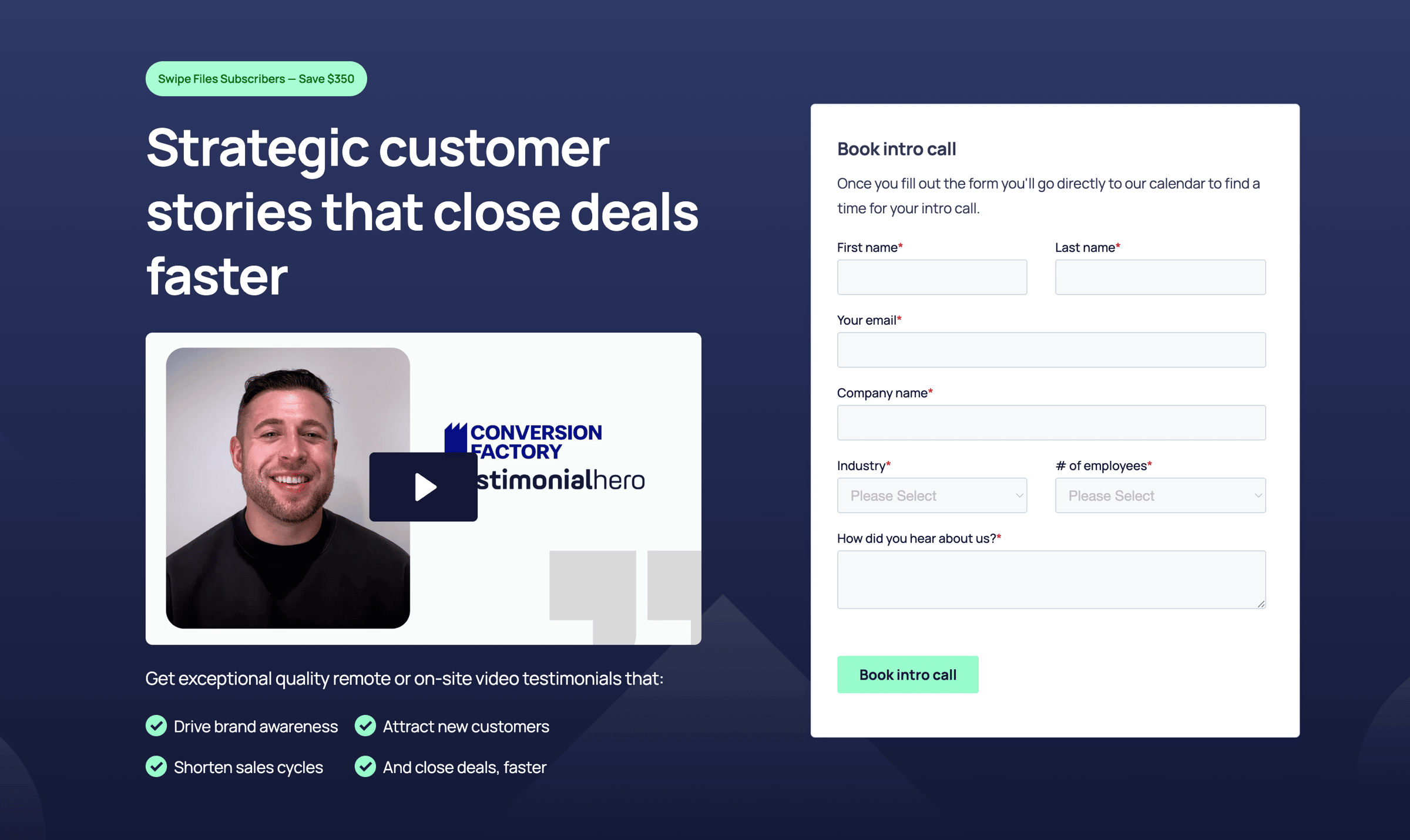 | | Today's newsletter is proudly supported by Testimonial Hero π Need a standout video testimonial that actually converts? I partnered with Testimonial Hero after they knocked it out of the park for my agency, Conversion Factory. They took the hassle out of capturing our client's story, delivering a polished video that's now front and center on our site. I was so impressed, I even let them film me for their own testimonial! Mention "Corey" or "Swipe Files" to snag $350 off your first project. | |
