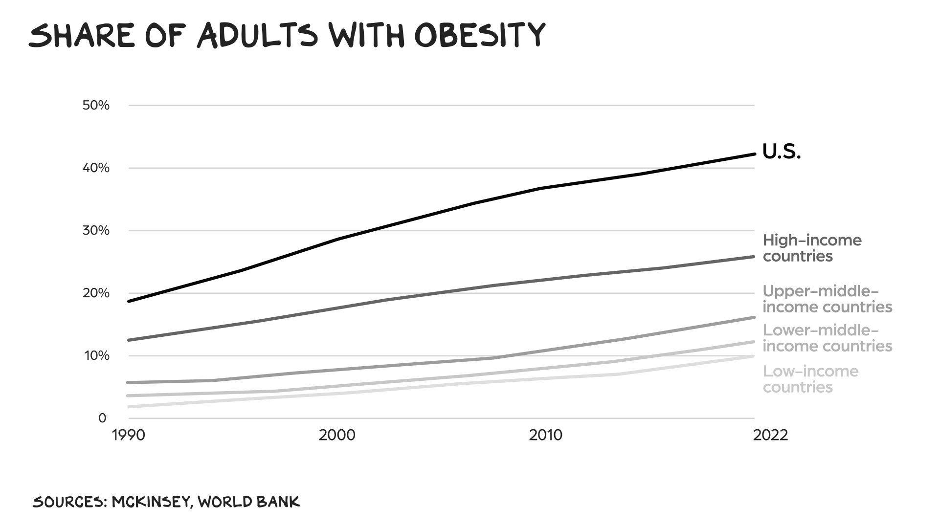| | Was this newsletter forwarded to you? Subscribe here | | America is now one giant bet on AI. If not for the Magnificent 10, the markets would be flat for the year. There's a different technology that offers more asymmetric upside. If we want to transform the economy — and the well-being of Americans — we should focus on GLP-1, not GPT-5. | More than 40% of American adults — 100 million people — are struggling with obesity. By 2060 half of U.S. adults may be obese. The healthcare costs of all that extra weight could exceed $20 trillion over that period. | Our debt — $5 trillion in receipts vs. $7 trillion in spending — has become the IED of our economy. We don't know when or why it will detonate. If we're going to have an adult conversation re spending, all roads lead to the same place: healthcare. We spend $13,000 per person, versus $6,500 in the rest of the G7. Matching the efficiency of our peers would save us $2 trillion a year. | Why do we spend double to die sooner, while experiencing more anxiety, depression, and chronic illness? Our problem isn't vaccines, food dyes, or Tylenol. It's fat. The Milken Institute and McKinsey have estimated that obesity costs us about $400 billion annually in direct medical costs and lost productivity. | U.S. healthcare isn't about caring for health — it's about monetizing it. Just as Big Tech found the gangster app for shareholder value (rage), the industrial food, hospital, and pharma complexes have found obesity. They get you addicted to sugar and salt, then hand you to the "non-health" complex for replacements, dialysis, and statins. They've even rebranded disease as identity: You're not obese, you're living your truth. No — you're finding diabetes. McDonald's and Coca-Cola celebrate obesity so UnitedHealthcare can monetize it. These stocks aren't equities; they're obesity indices. | | We know exercise, healthier food, and less screen time help. But they're not enough. The good news: Obesity may have peaked in the U.S., and we have the tools to actually reverse it. Pushing for a radically lower price and rolling out weight-loss drugs to tens of millions of Americans could be revolutionary — possibly the best civic investment in recent history. | Sticker Shock | In sum, our instincts have not kept pace with industrial production, and we gorge. GLP-1s put scaffolding on our instincts. Most of us have friends or colleagues we barely recognize after they've taken novel weight-loss drugs. By mimicking a hormone called GLP-1, the medicines suppress hunger and make us feel fuller longer. The results are dramatic — 15% to 20% reductions in body weight — yet uptake remains small relative to the tens of millions who could benefit. | | Coverage is patchy. Only 30% to 40% of commercial plans and 14 state Medicaid programs cover the cost of GLP-1s for obesity. The administration is considering a pilot to expand coverage under Medicaid and Medicare — a shift in policy after rejecting a Biden-era plan that would have cost $35 billion over 10 years. | Prices need to fall for the math to work. If Medicare began covering GLP-1s, researchers estimate 3 million beneficiaries would start using them over the next decade at a gross cost of $66 billion and savings (in avoided healthcare spending) of $18 billion — for a net price tag of $48 billion. | Price Cuts | Costs are moving in the right direction. Wegovy and Ozempic now run under $7,000 a year; Costco offers a monthly supply of obesity drugs for $499; and competition from Lilly and others is driving prices down. More than 100 next-generation obesity drugs are in development, including pill versions. | President Trump on Oct. 16 vowed to slash GLP-1 prices to $150 a month to match the expense in other developed nations, but no deal yet exists with drugmakers. Investors, however, took him seriously: Shares of Novo Nordisk and Lilly dropped sharply on the news. | Economist Emily Oster argues the budgetary worries of expanding access are overstated. Medicaid tends to pay far less than private insurers, and a "typical" 53% discount could drop monthly costs to $235. If 10% of eligible patients took the drugs, it would raise Medicaid spending by just 0.4%. | The concerns also miss the upside: About 5 million U.S. adults use GLP-1s today. If 30 million did, Goldman Sachs estimates GDP would rise as much as 0.8%. At 60 million, the increase could exceed 1%. | | Global Weight Class | America isn't the only country fighting this epidemic. In Britain, obesity costs the economy £31 billion a year in lower productivity, sick days, and early deaths. "We've created a food system that's poisoning our population and bankrupting the state," says Henry Dimbleby, co-founder of Leon restaurants, which bills itself as a purveyor of fast but healthy meals. | | Defusing the Food Bombs | These drugs aren't a silver bullet, but they are a bullet. Many people quit taking them within a year or two, often because of cost or gastrointestinal side effects, and lasting success still requires exercise and diet changes. But alongside those measures, GLP-1s may be the key to fighting a complex disease rooted in physiology, environment, and policy as much as behavior. | In a society addicted to ultra-processed food and sedentary hours lost in front of screens, we need new weapons. Former FDA commissioner David Kessler calls GLP-1s a way to "defuse the ultra-formulated food bombs" that have hijacked our health. | RFK Jr. has called for "lifestyle" changes while cutting NIH funding — the moral equivalent of telling people to lift weights while closing the gym. The administration's "Secretary of War," Pete Hegseth, has shamed "fat generals" but offers no help other than performative masculinity. | Bending the Curve | Scaling access could prevent adult obesity from topping 50% — and push it back toward 30%. Giving 10 million Americans GLP-1s and lowering their monthly cost to $50 would run $12 billion over two years. Tha