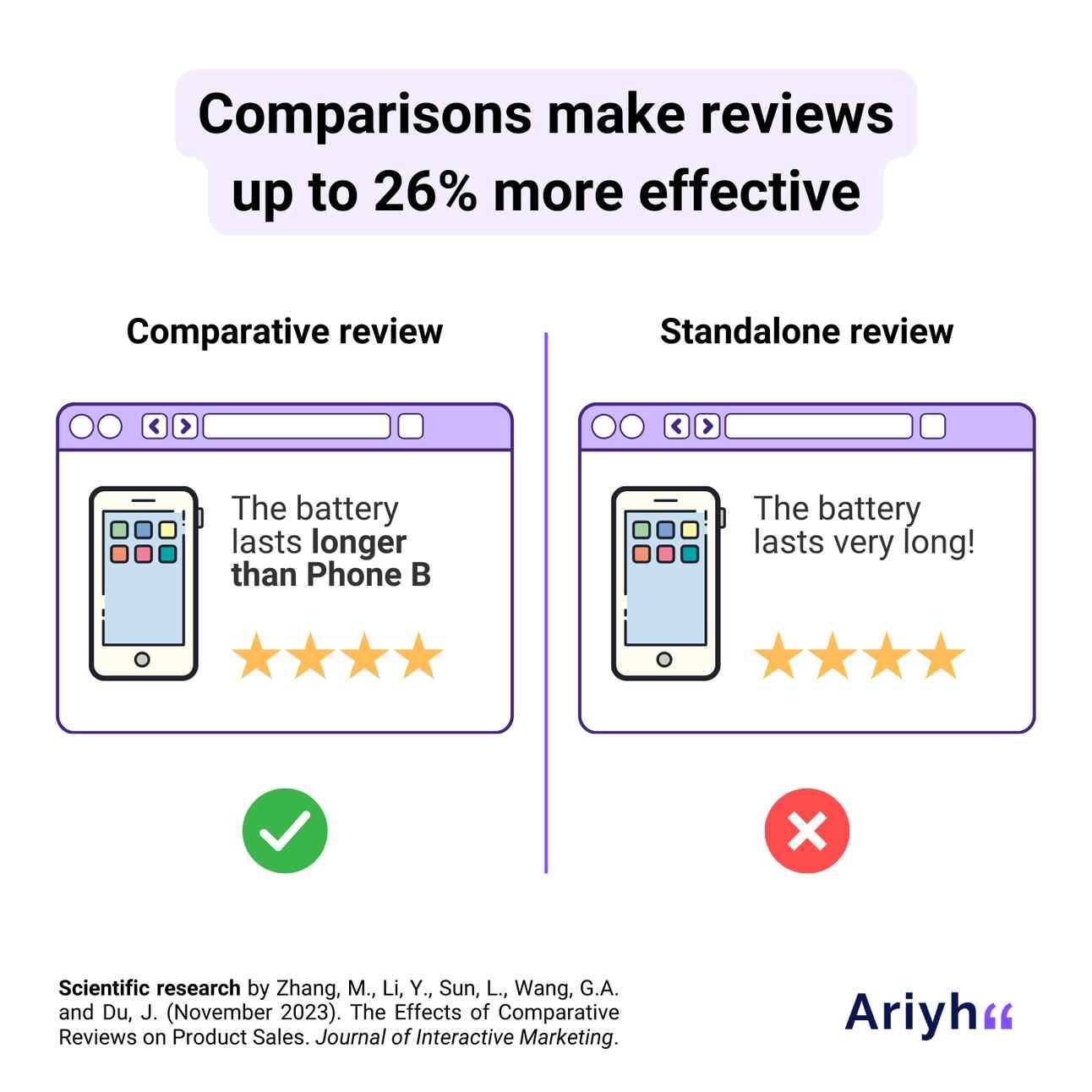 - Positive reviews that compare your product increase sales by up to 26%. They anchor your product as being better than competitors. For example, "The iPhone 17 has a better camera than my friend's Google Pixel 10" is more persuasive and effective than "The iPhone 17 camera is really good."
